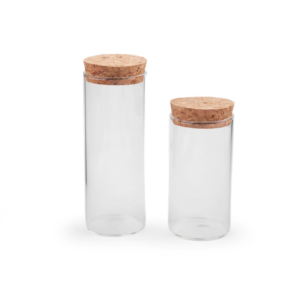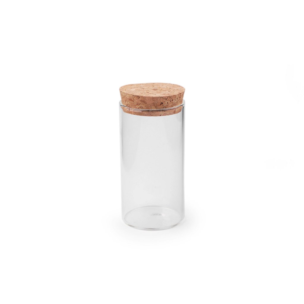 Kulatá skleněná dóza s rovnými stěnami je díky korkovému uzávěru nejen velmi hezká, ale i praktická. Dá se do ní naaranžovat písek s mušlemi z dovolené, potpourri, umělé sukulenty apod. Prakticky ji můžete využít třeba na koupelovou sůl či na skladování větších korálků.