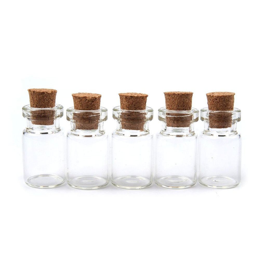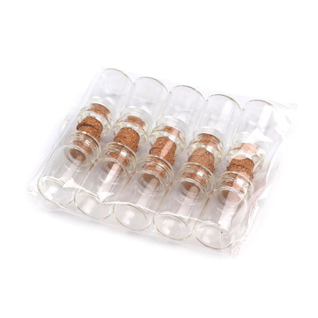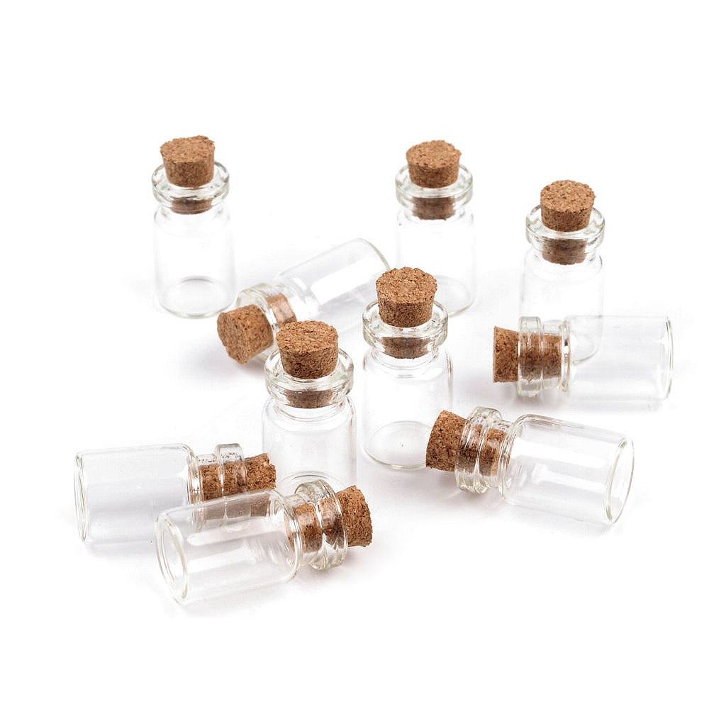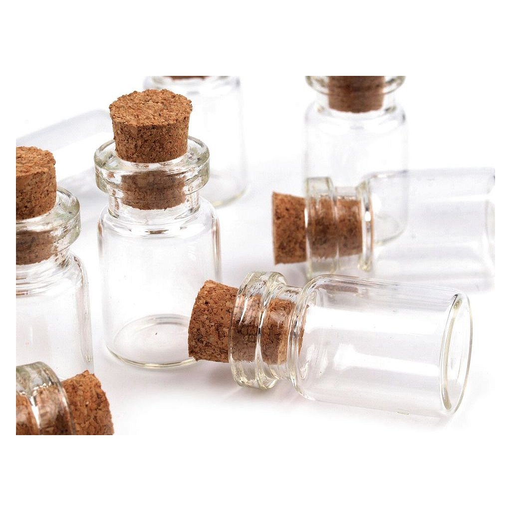 Velmi praktická a slušivá skleněná lahvička se nejčastěji používá jako přívěsek na krk. Zátka je vyrobena z korku. Lahvičku můžete dekorovat např. jemným barevným pískem, různými úlomky minerálů, kamínky, rostlinkami atd. nebo do ní lze vložit třeba i malý dopis. Jako šňůrku můžete použít kůži, která na přívěsku pěkně vynikne, řetízek či lanko.Rozměry lahvičky jsou 13 x 25 mm (průměr dna x výška). Průměr hrdla je 8 mm.Rozměry korku jsou 7 mm (širší průměr 9 mm) x 10 mm (průměr x výška).Obsah lahvičky po hrdlo je 1,5 ml.