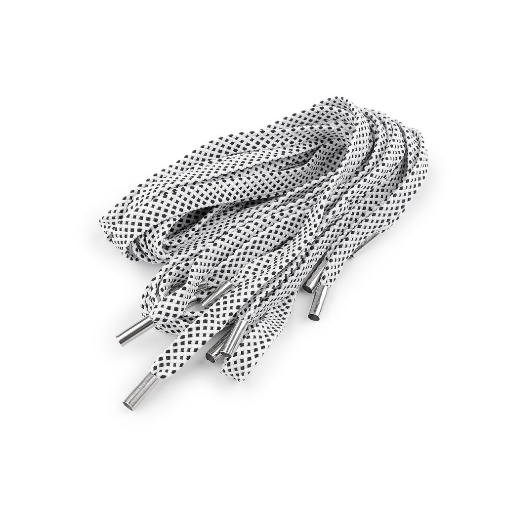 Pevná oděvní šňůra je plochá, s károvaným vzorem. Na obou stranách má kovovou koncovku. Délka koncovek je 1,8 cm.