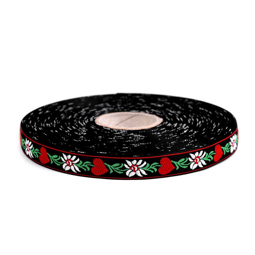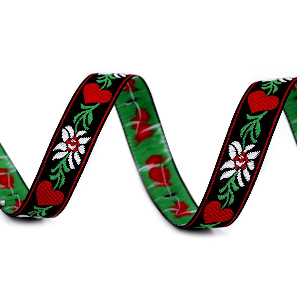 Krojová vzorovka je ozdobená motivem květů a srdcí. Je velice kvalitní, tkaná na jehlových stavech. Kromě šití kroje vzorovku využijete na zdobení oděvů i bytového textilu (ubrusy, prostírání, polštáře apod.). Její použití je velice variabilní.
