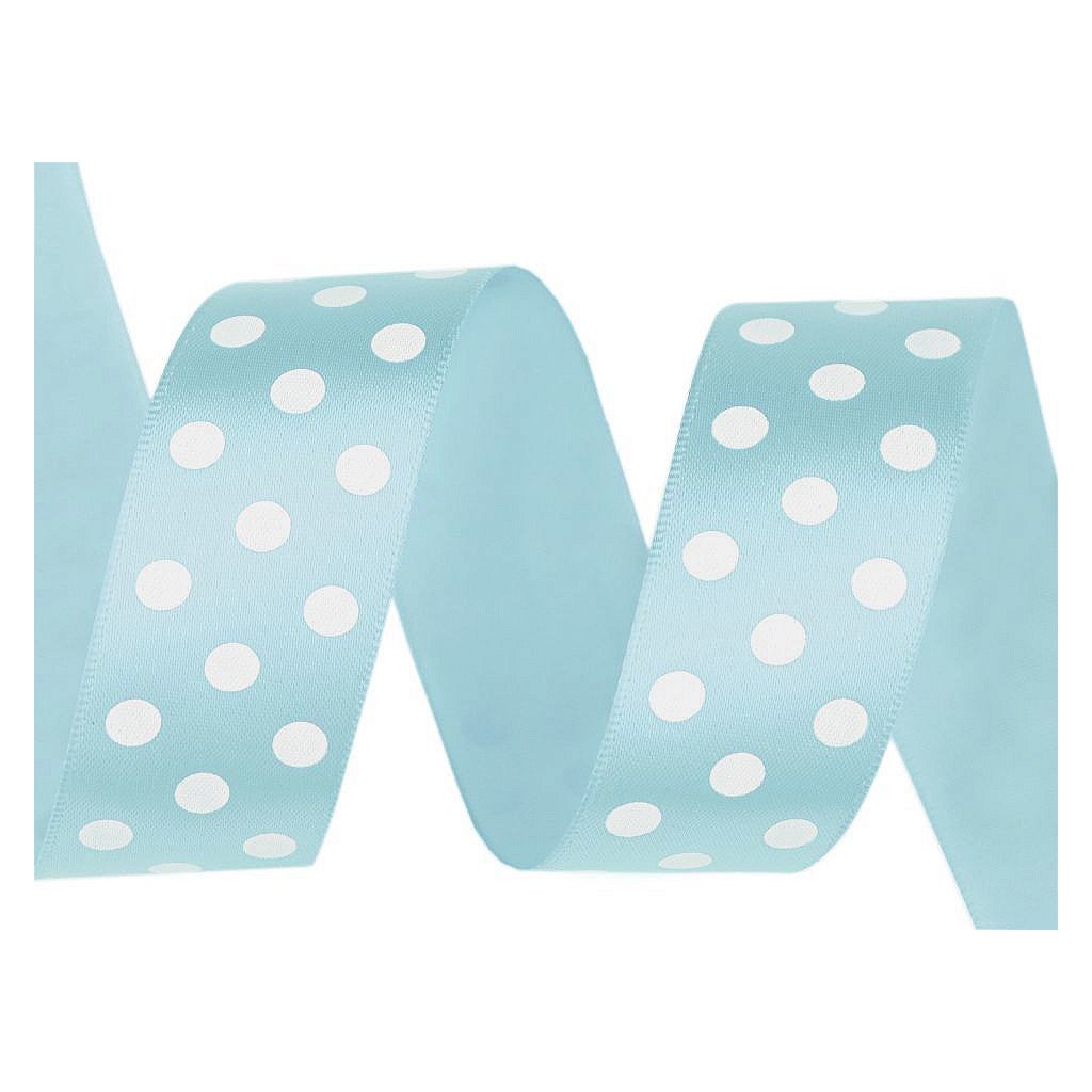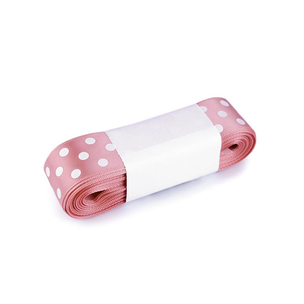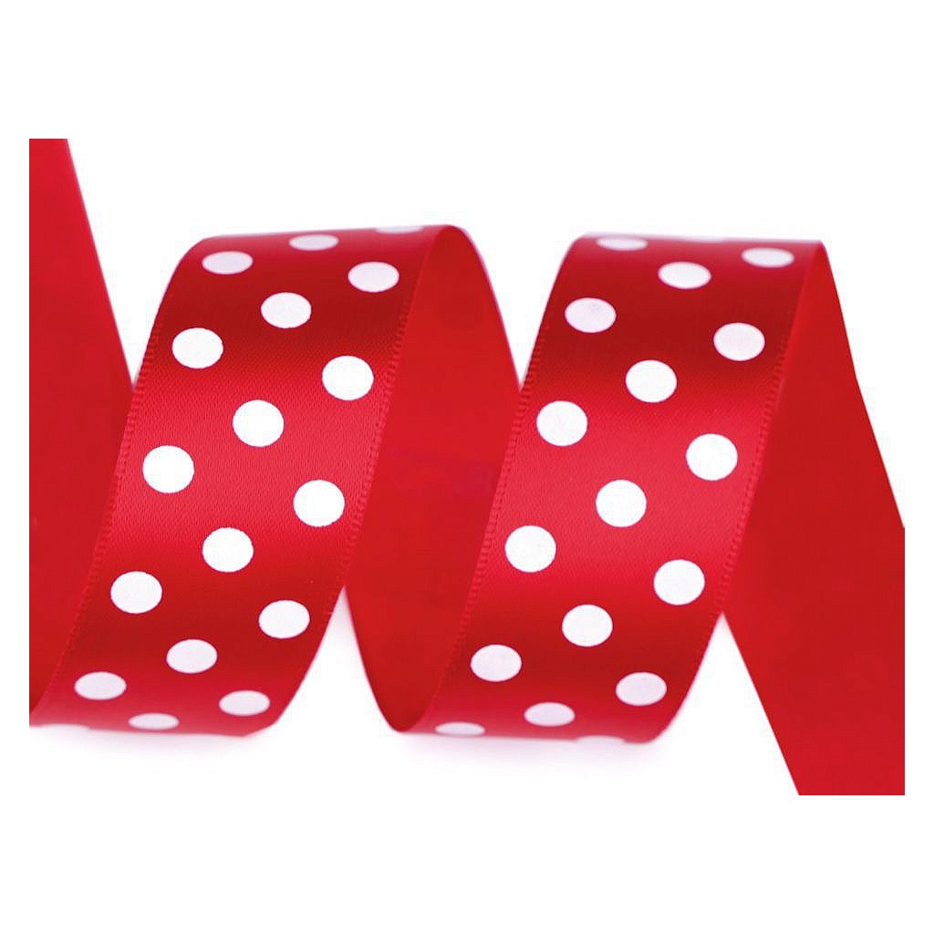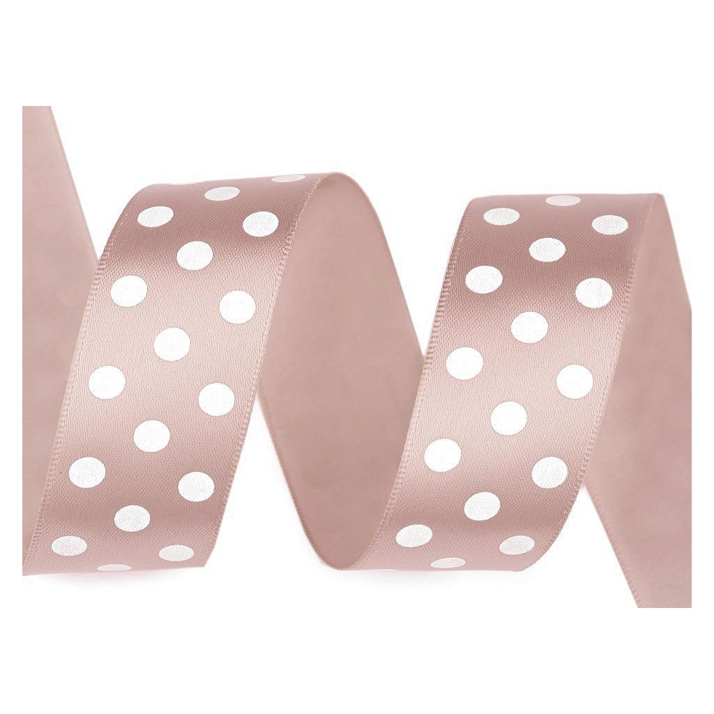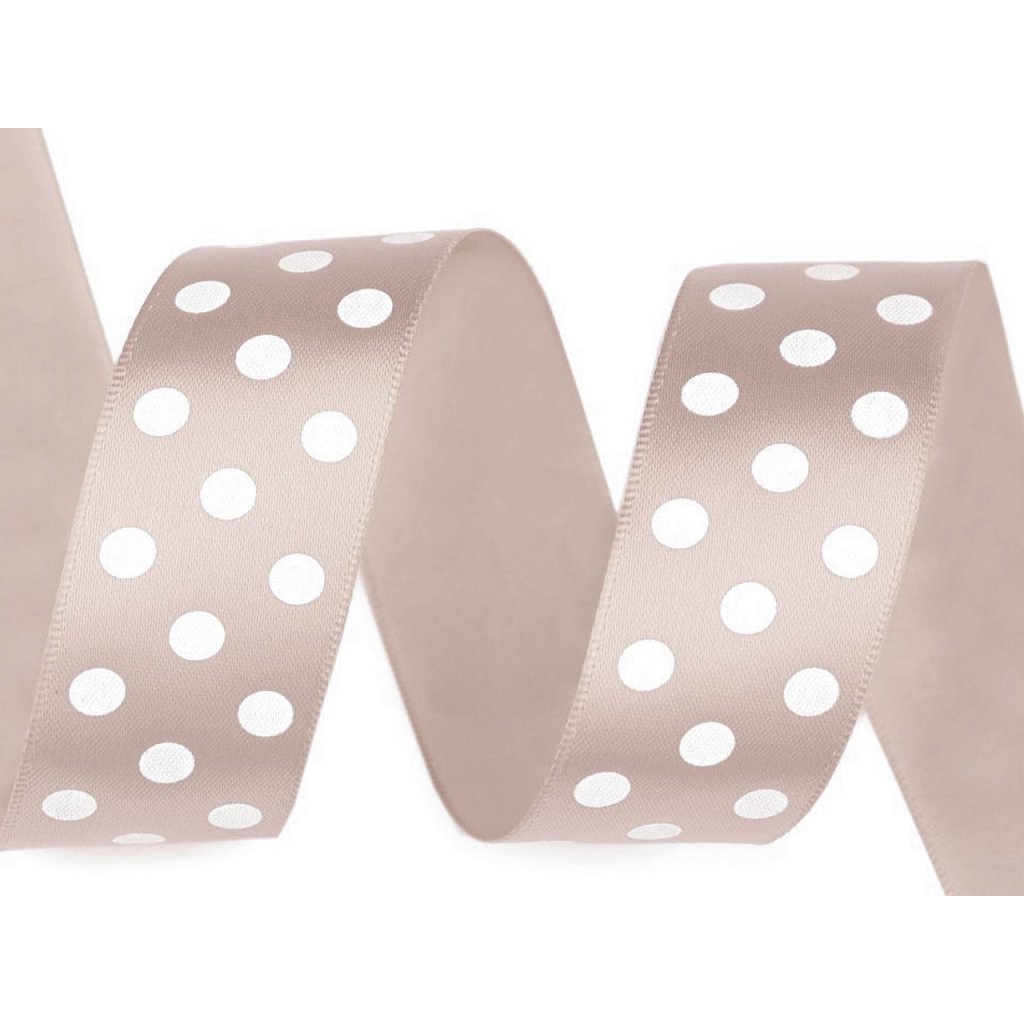 Saténovou stuhu zdobí potisk puntíků, který je jednostranný. Její povrch se jemně leskne.