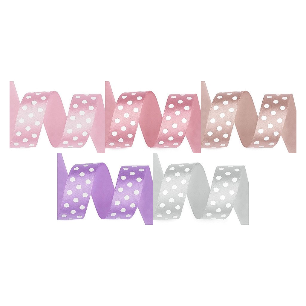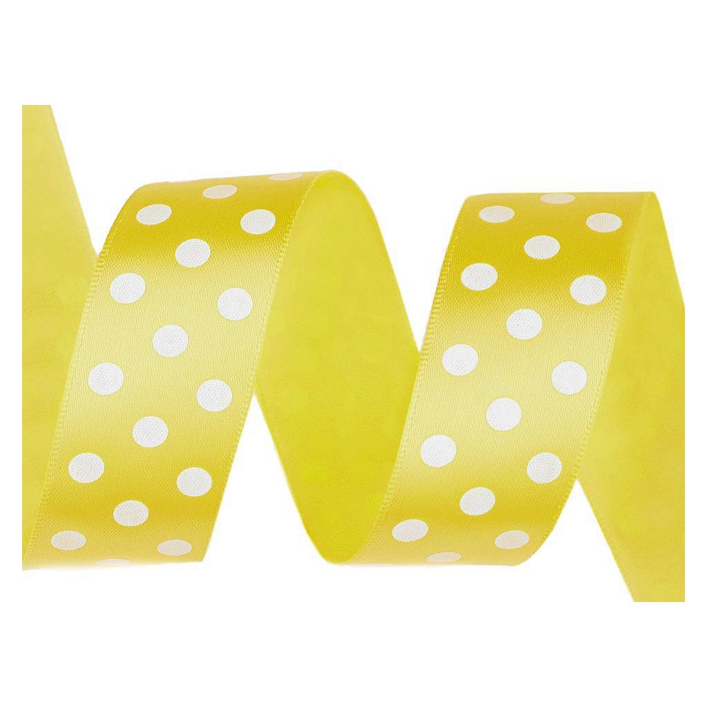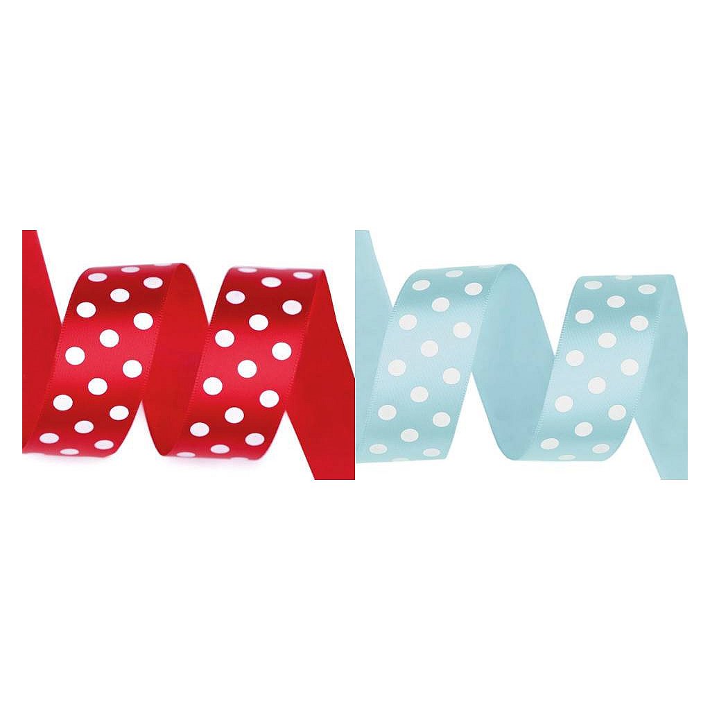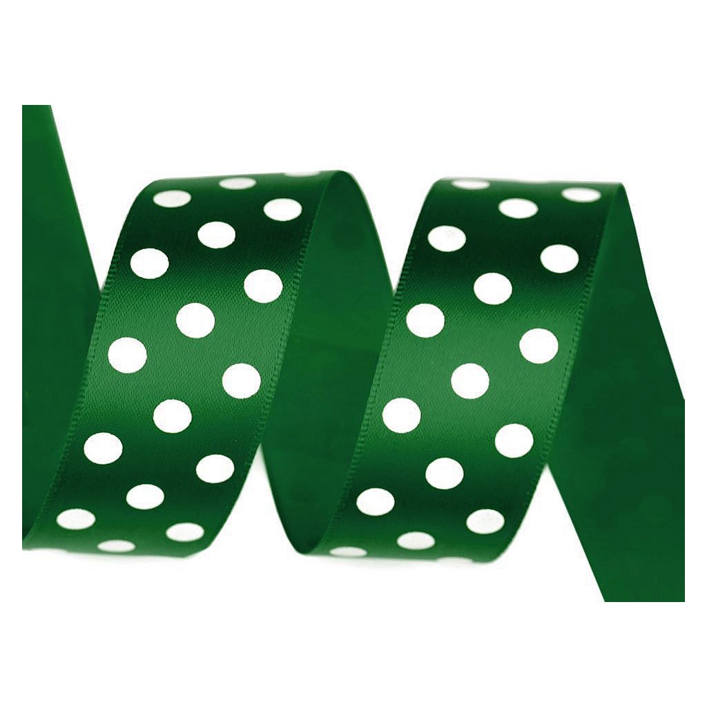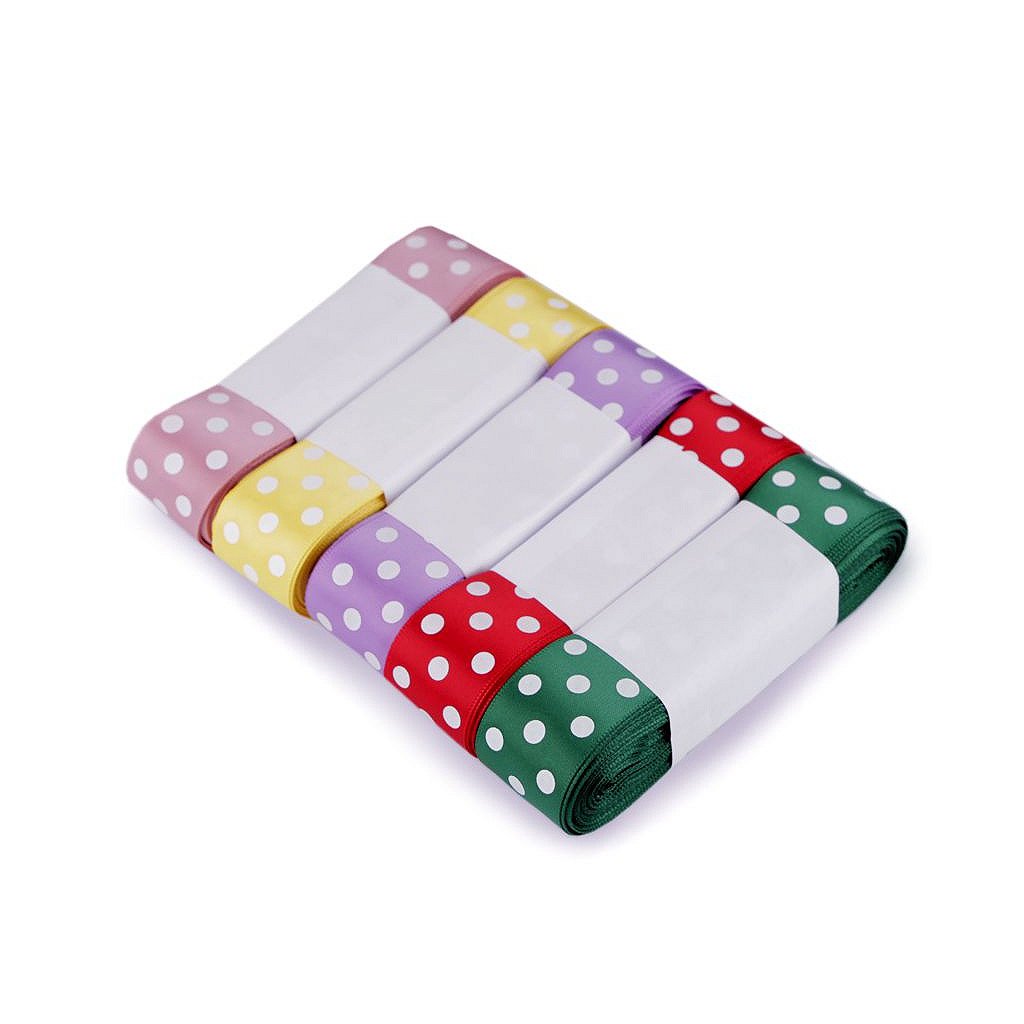 Saténovou stuhu zdobí potisk puntíků, který je jednostranný. Její povrch se jemně leskne.
