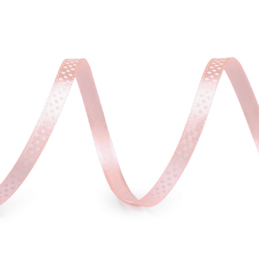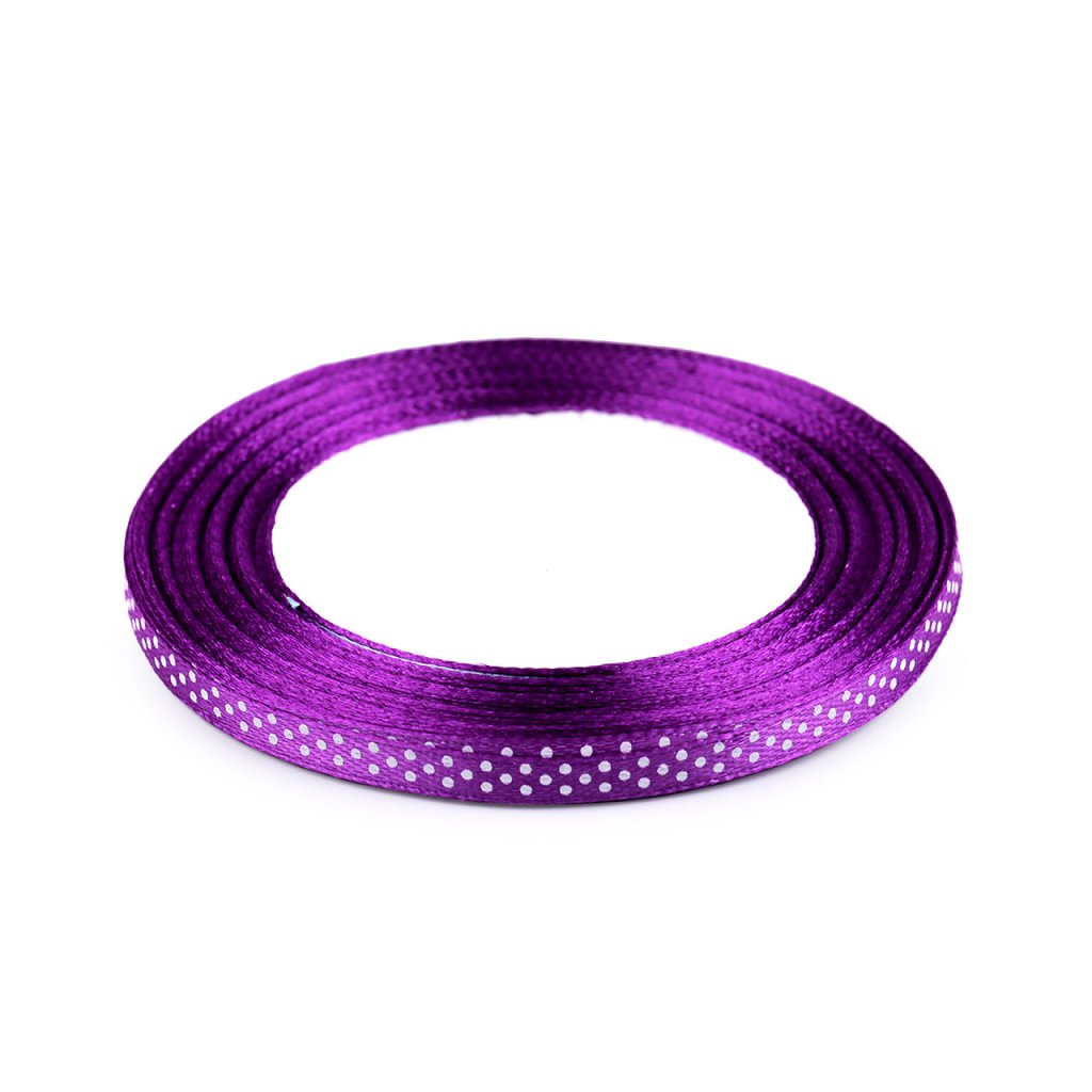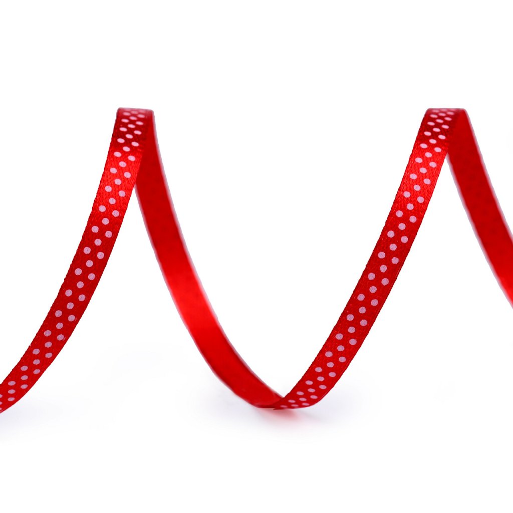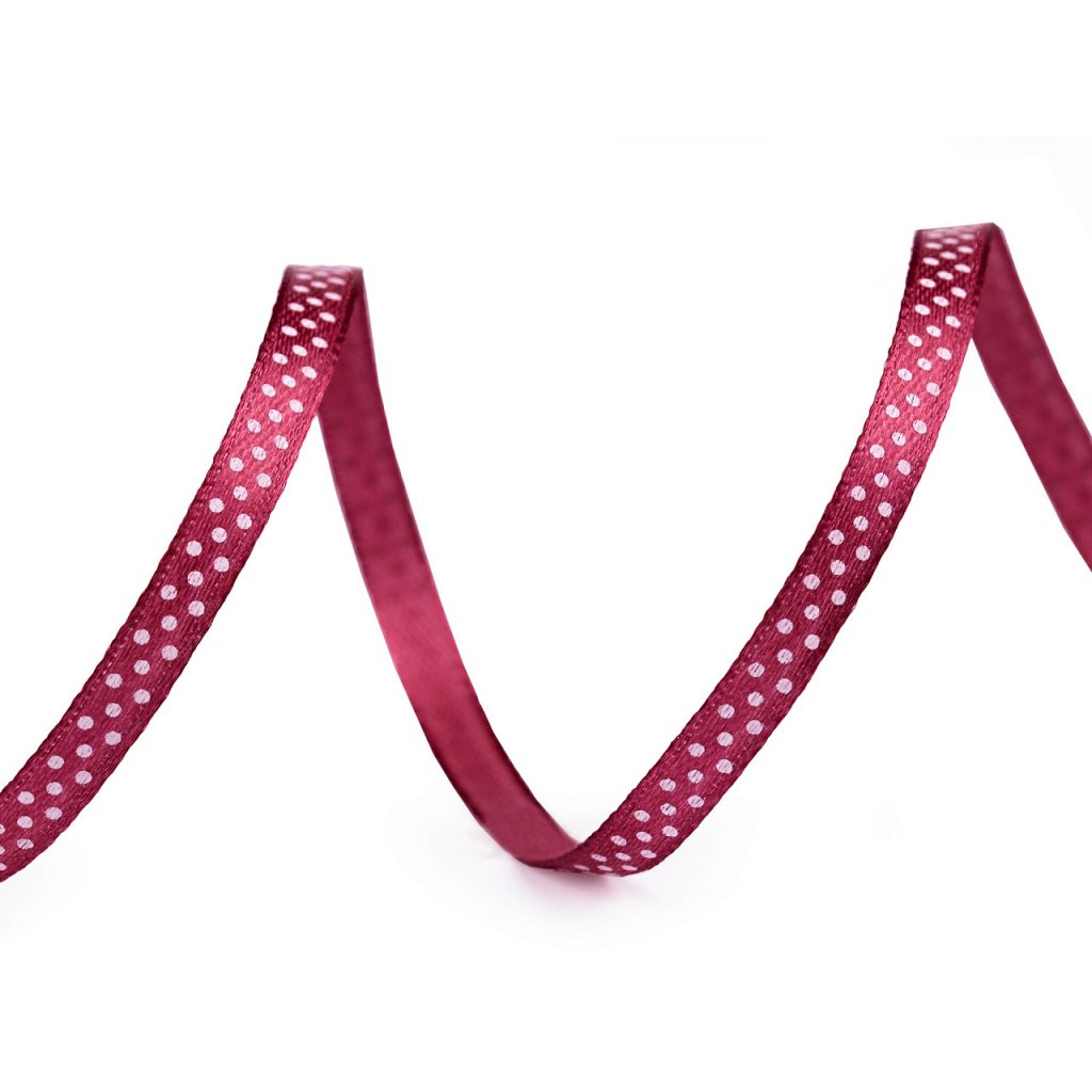 Saténovou stuhu zdobí potisk s veselými puntíky. Stuha je pevná, jednostranná.