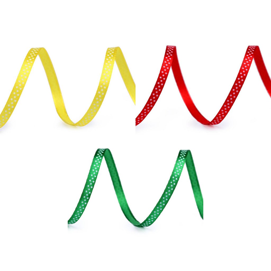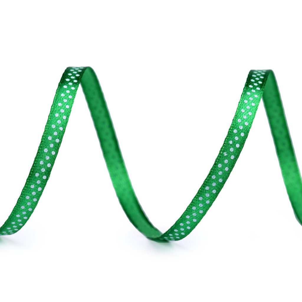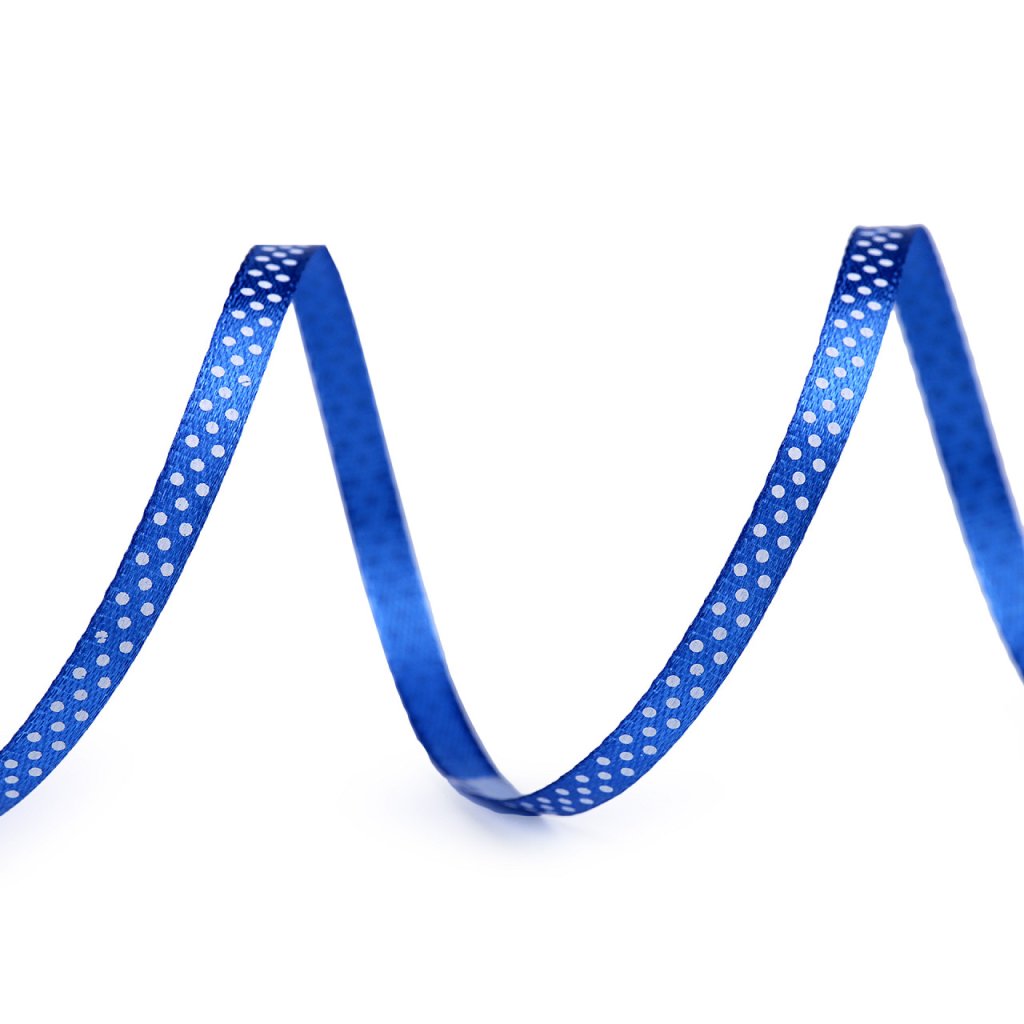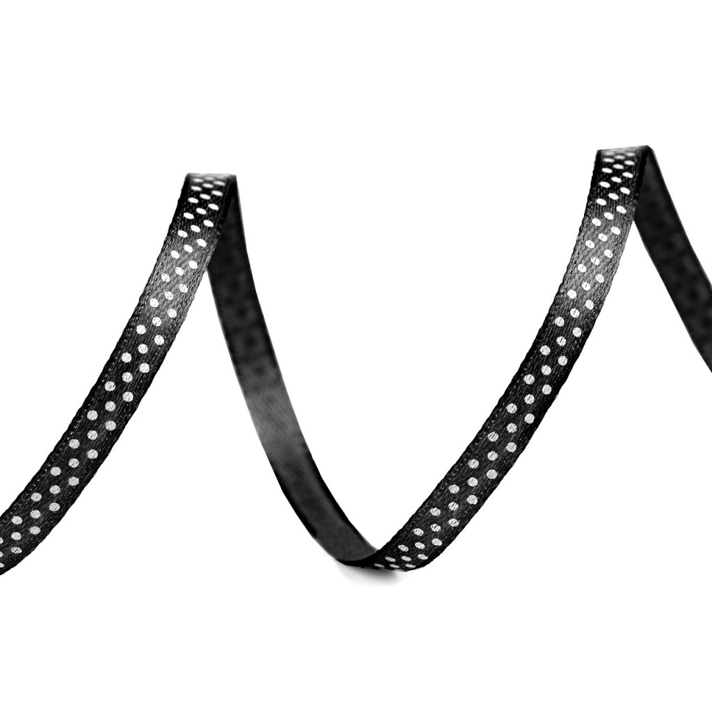 Saténovou stuhu zdobí potisk s veselými puntíky. Stuha je pevná, jednostranná.