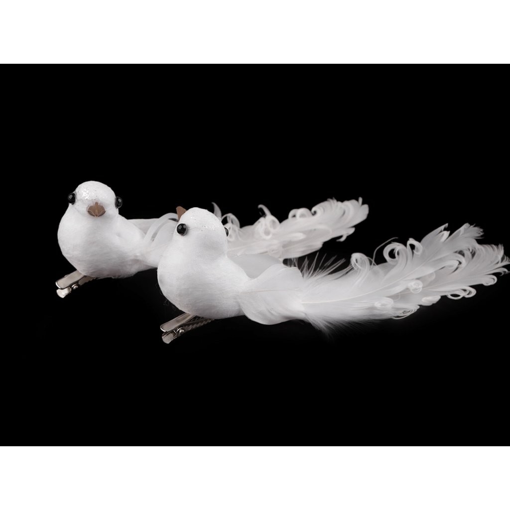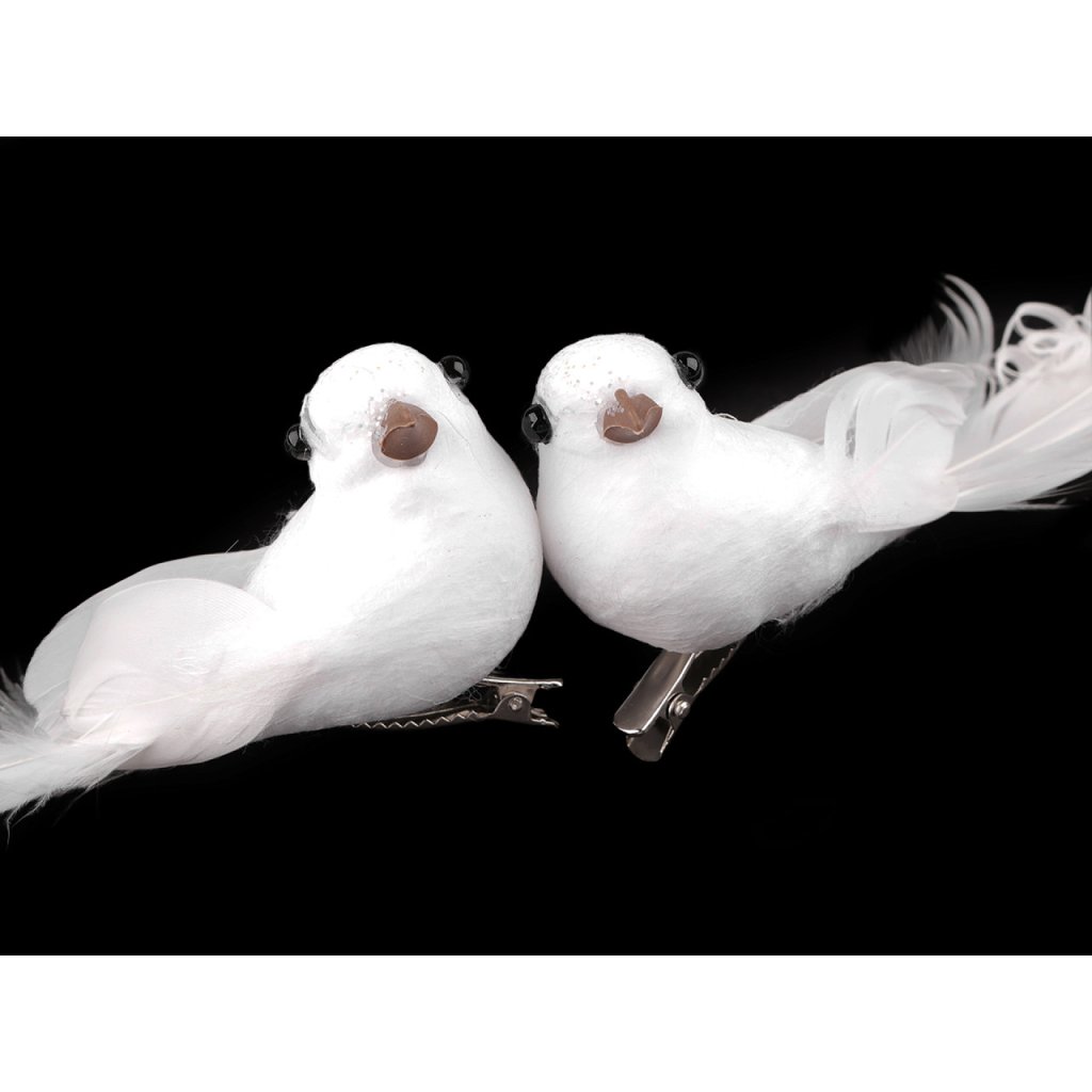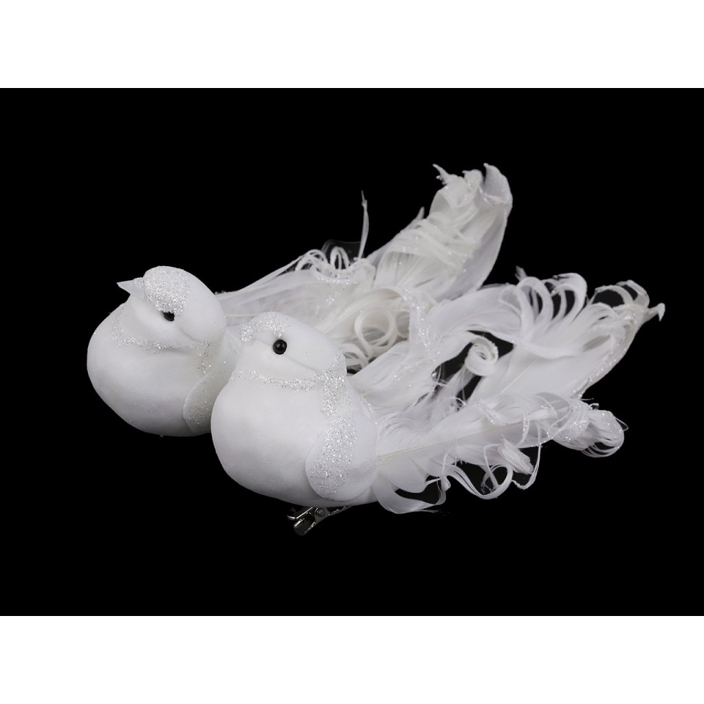 Dekorační holubici zdobí působivá kudrnatá peříčka. Zespodu má připevněnou kovovou sponu, díky které ji můžete připevnit například na věnec, větvičku, záclonu či ji naaranžovat do květinových vazeb. Hodí se ke svatebnímu i vánočnímu aranžování.