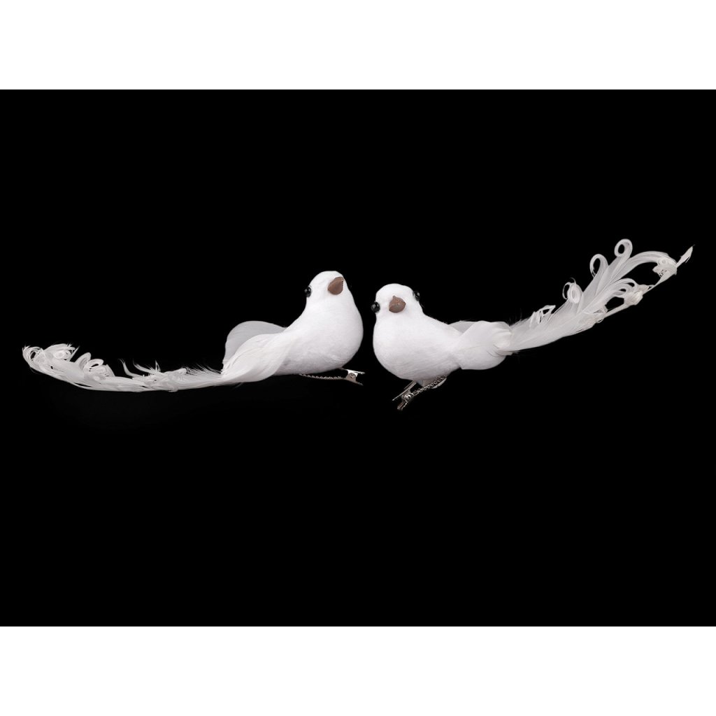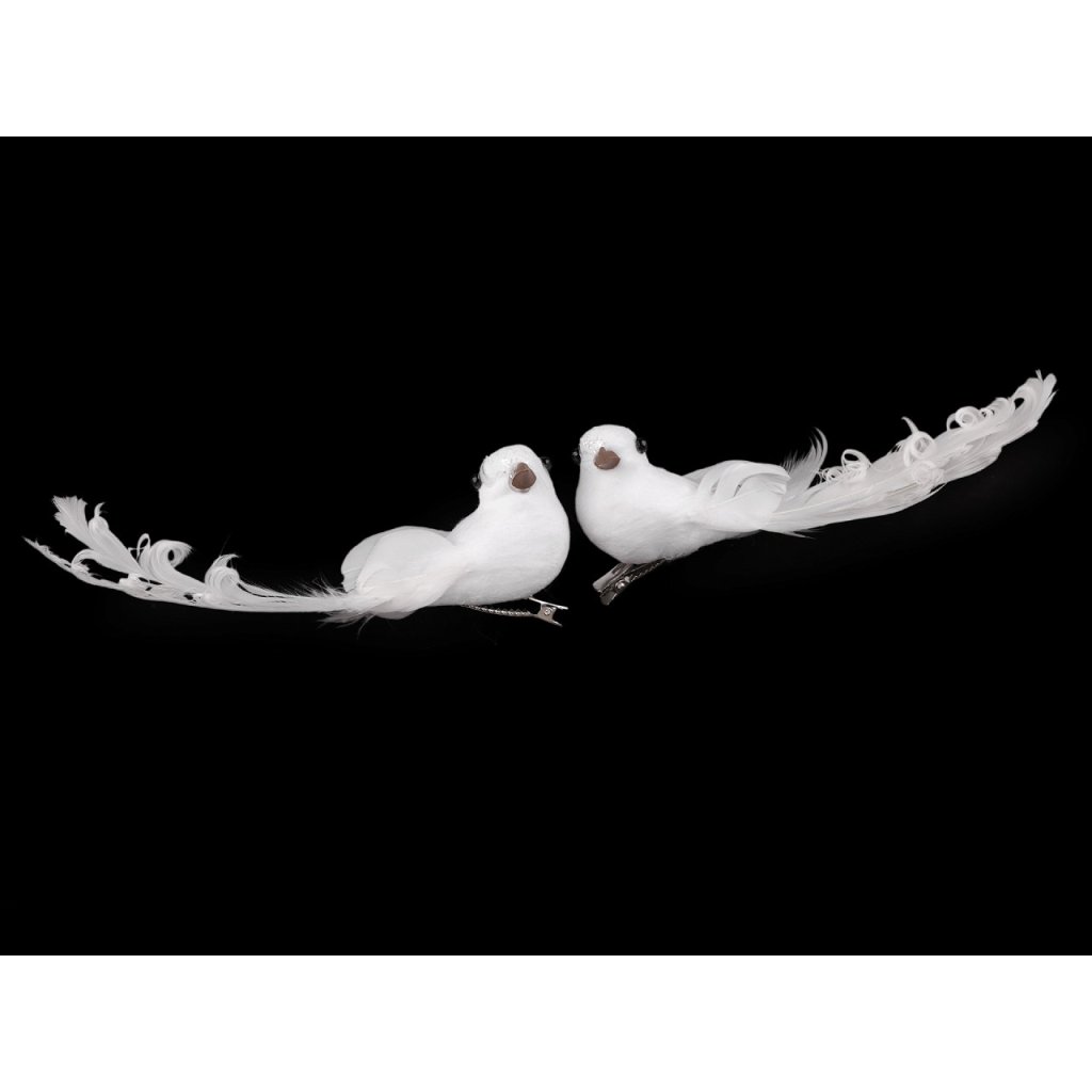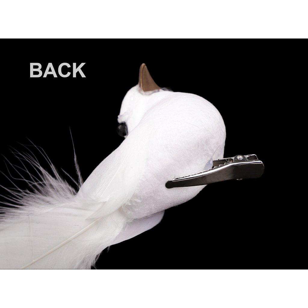 Dekorační holubici zdobí působivá kudrnatá peříčka. Zespodu má připevněnou kovovou sponu, díky které ji můžete připevnit například na věnec, větvičku, záclonu či ji naaranžovat do květinových vazeb. Hodí se ke svatebnímu i vánočnímu aranžování.