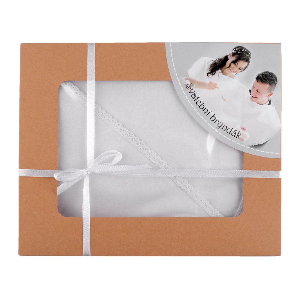 Svatební bryndák ocení novomanželé při prvním společném obědě. Lemuje ho romantická paličkovaná krajka. Bryndák můžete ještě dozdobit dle svého vkusu.
