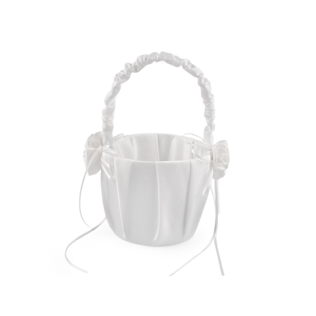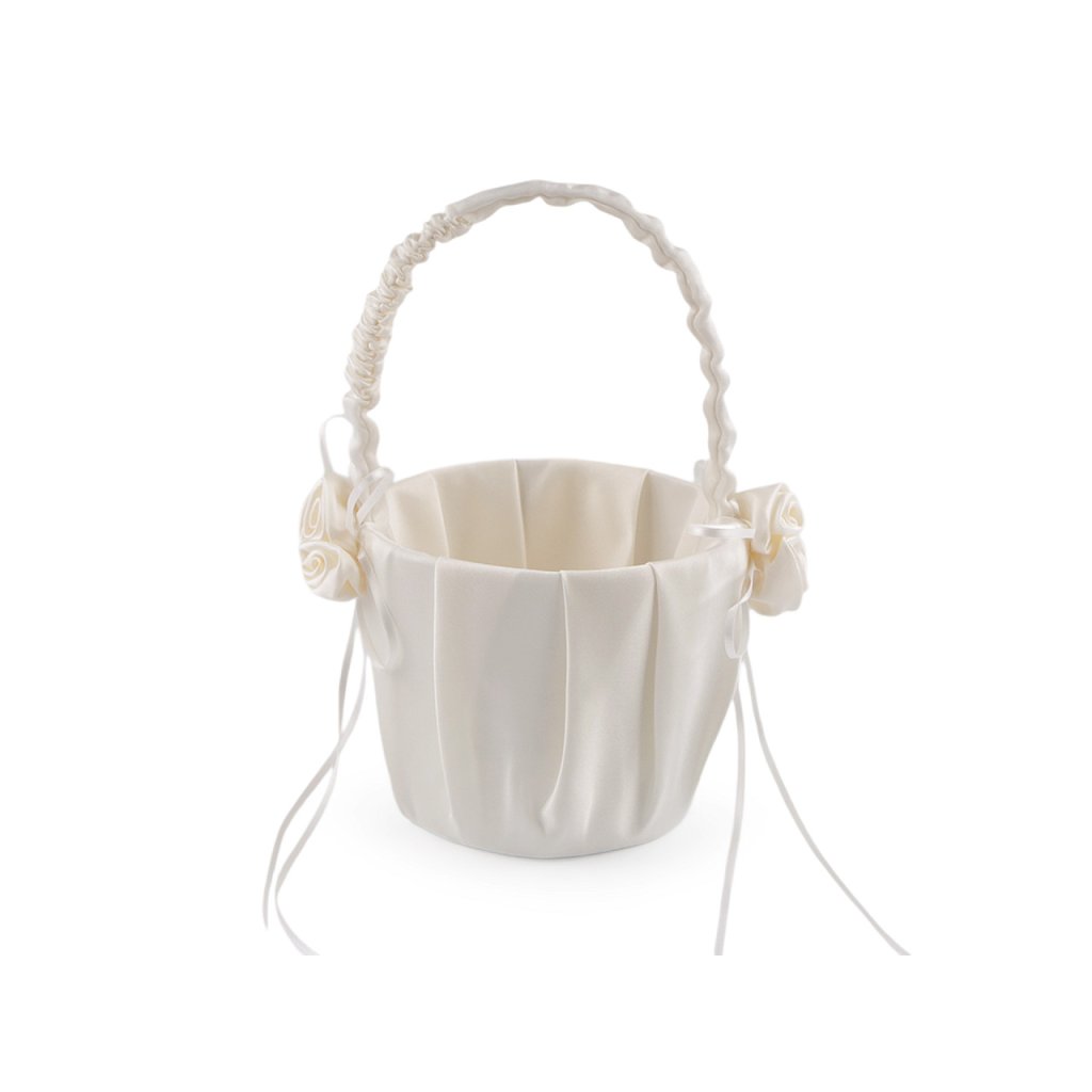 Saténový košíček je skvělým svatebním doplňkem pro malé družičky. Uvnitř košíčku se budou vyjímat plátky růží nebo květinová aranžmá. Košíček je vyrobený z pevnějšího plastu. Zdobí ho mašle ze stuhy, ucho s perlovými korálky, broušené kamínky a šifónové volánky.