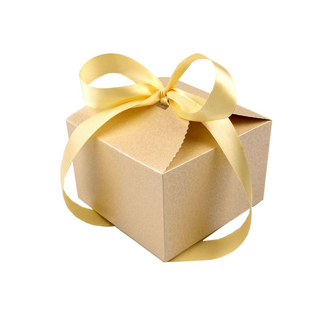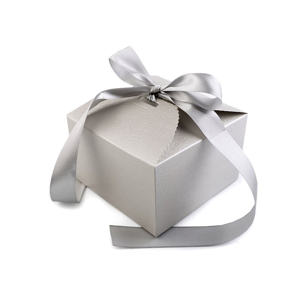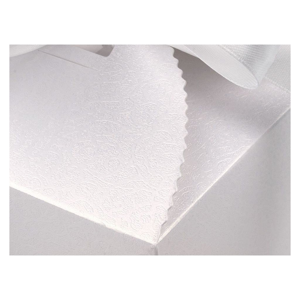 Luxusní papírová krabička je vyrobená z perleťového papíru. Její povrch zdobí jemný reliéf. V horní části jsou vyseknuté otvory, kterými se provleče stuha na zavázání.