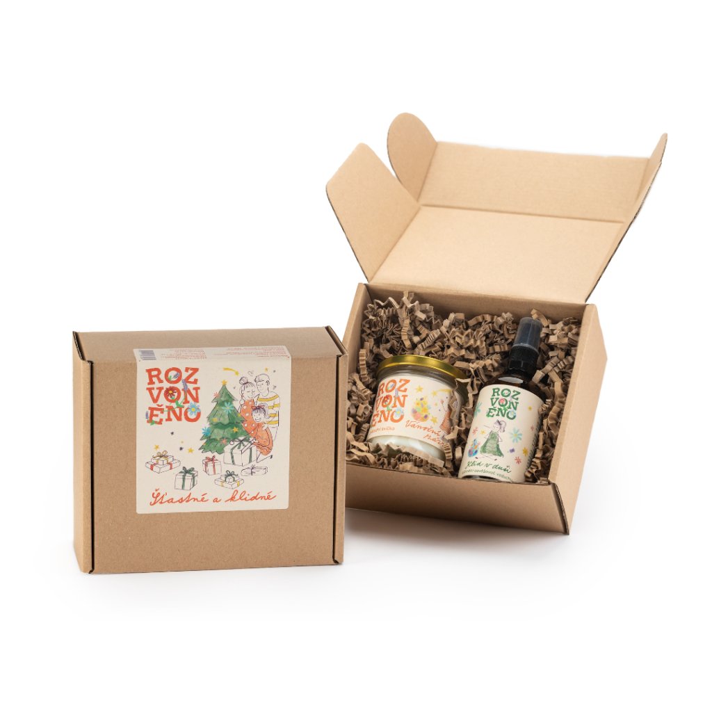Rozvoněno Dárkový balíček Šťastné a klidné - s vonnou svíčkou a osvěžovačem vzduchu