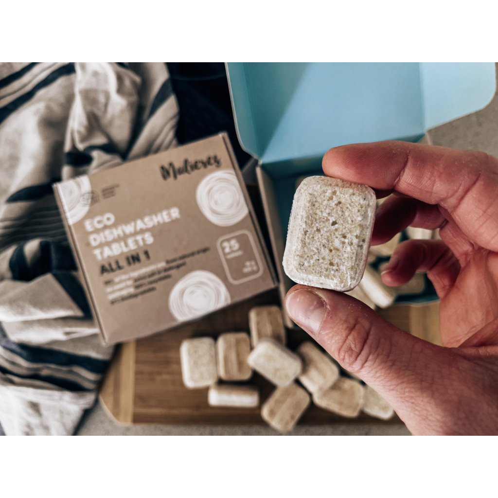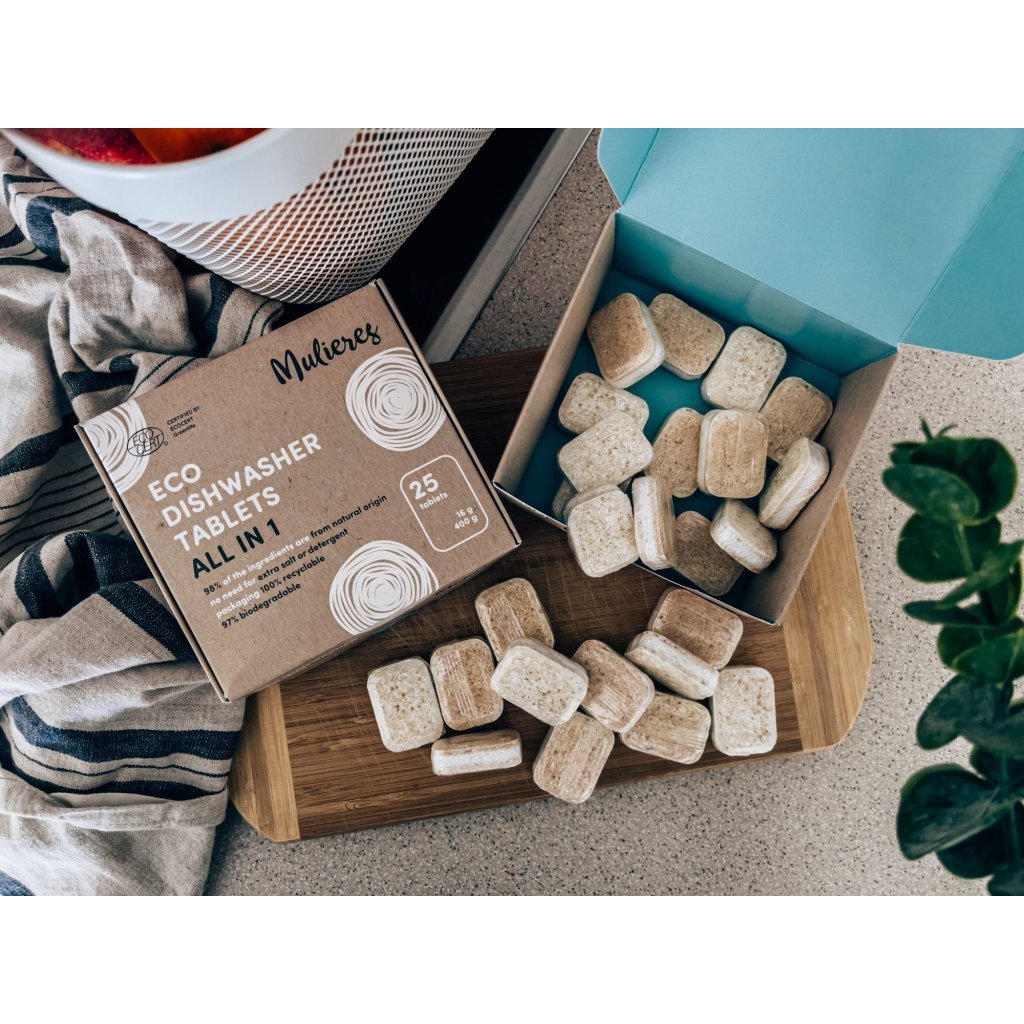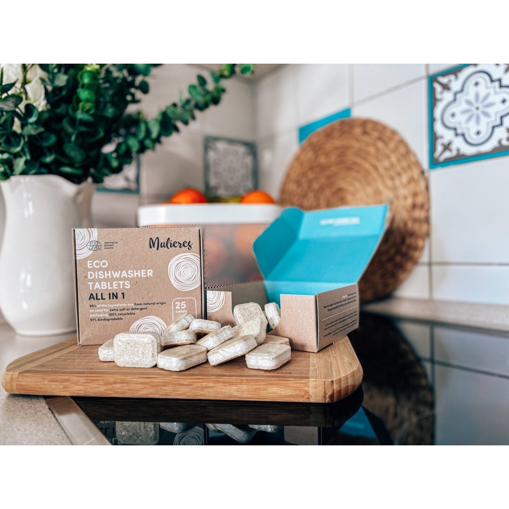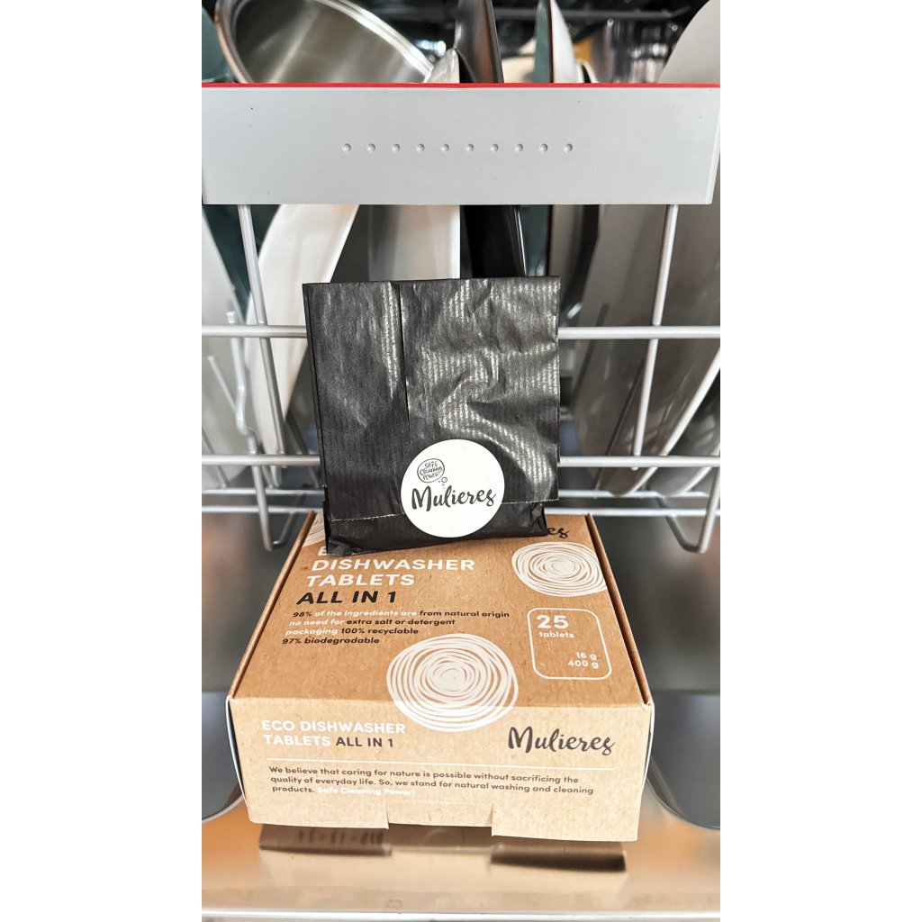 V Mulieres vyslyšeli úpění všech myček, které se také chtějí stravovat zdravě a ekologicky. Z šetrně získaných rostlinných a minerálních látek proto vytvořili tyto tablety s certifikací Ecocert. Skvěle si poradí i s tvrdohlavými a zaschlými nečistotami a skleněné i nerezové nádobí z myčky vyplivnou nablýskané jako nikdy. Při jejich výrobě nebyla použita ani kapka vody, chráněné jsou obalem, který se ve vodě zcela rozpustí a svými skvělými mycími schopnostmi rády oblažují i veganské domácnosti.. Otestovali jsme tablety na vlastní myčku. Pějí se na ně ódy oprávněně a opravdu přeperou konvenční přípravky? Hoďte očkem do upřímné recenze. :)