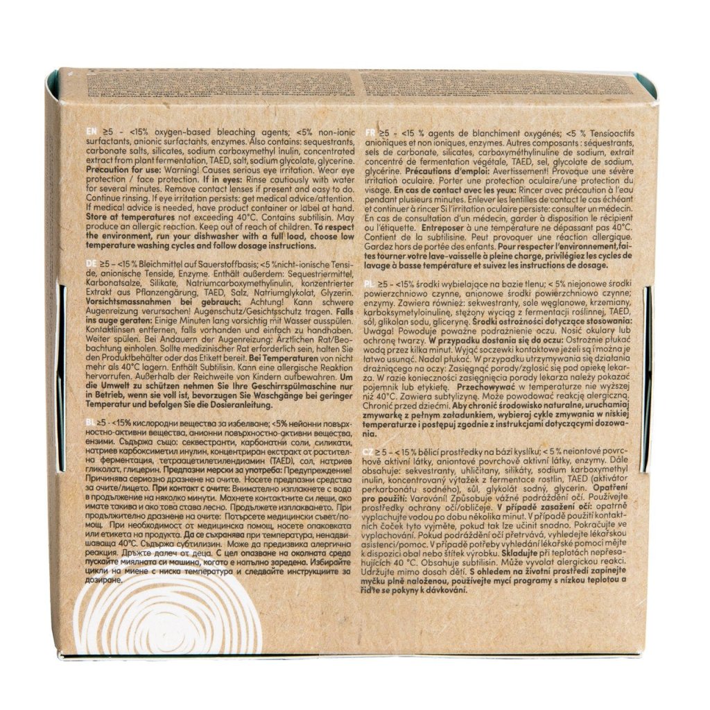 | Materiál balení: | Recyklovaný karton, jednotlivé tablety jsou baleny v biodegradabilních a ve vodě rozpustných sáčcích |