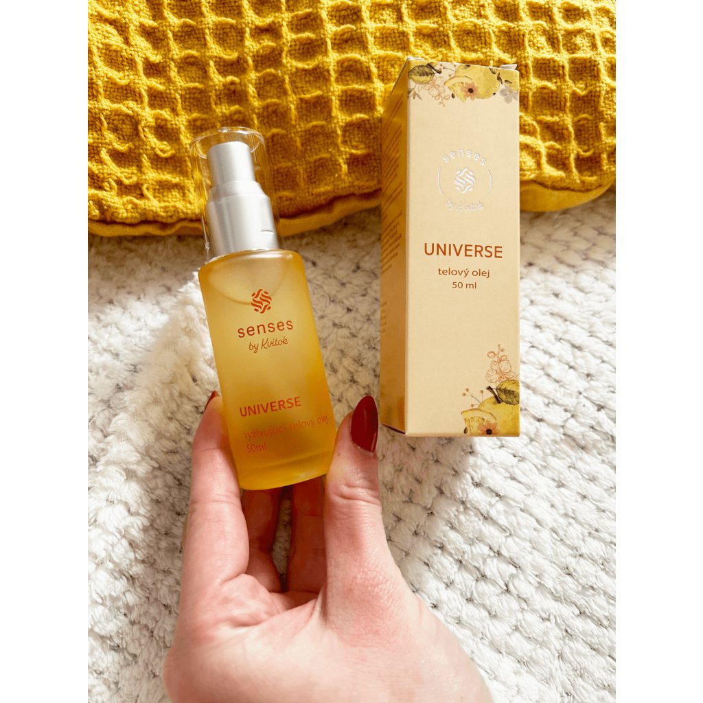 100% přírodní tělový olej Universe z řady Senses je potěchou pro smysly. Citrusové tóny v kombinaci se zeleným jablkem propůjčují oleji příjemnou svěžest, hřejivá pačule, tonka a santalové dřevo aroma uzemňují. Ve složení dominují lehké, suché a za studena lisované oleje z čajovníku čínského, papáji, pupalky nebo vzácného Sacha Inchi, které jsou bohaté na antioxidanty a polonasycené mastné kyseliny. V nich obsažená kyselina linolová má schopnost zlepšovat kožní bariéru, zdokonalovat celkový vzhled pokožky a snižovat hyperpigmentaci. Suché oleje mají tu zázračnou schopnost se rychle vstřebávat do pokožky bez nepříjemného mastného filmu. Po jejich aplikaci je kůže sametově jemná, vláčná a šťavnatá.