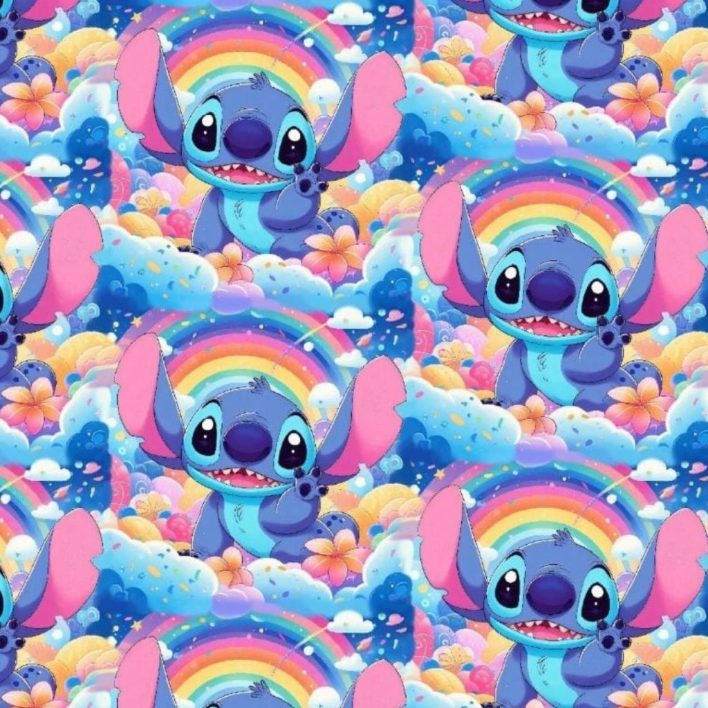 Teplákovina Stitch duha je nádherná nepodčesaná teplákovina (French Terry) s veselým designem, který rozzáří každý šicí projekt. Motiv oblíbené postavičky Stitch obklopený duhou, obláčky a květy přináší radost a barvy do každého dne!