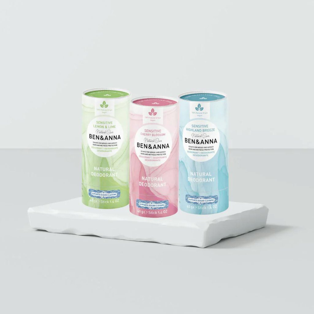 Přírodní tuhý deodorant Ben & Anna z řady Sensitive bez obsahu jedlé sody bude vyhovovat především citlivé pleti. Ve složení dominuje bambucké máslo a slunečnicový olej, které pokožku zklidňují, regenerují a propůjčují jí vláčnost a jemnost. Neutralizaci pachů a absorpci potu zajišťuje kombinace kukuřičného škrobu a hydroxidu hořečnatého. Balení minimalizuje užití plastů, zhotovené je z FSC certifikovaného a recyklovaného papíru. Deodorant neobsahuje hliníkové soli, ani ropné složky a je hrdým držitelem certifikátu Vegan Society, PETA a NaTrue.. [[rect_deo]]