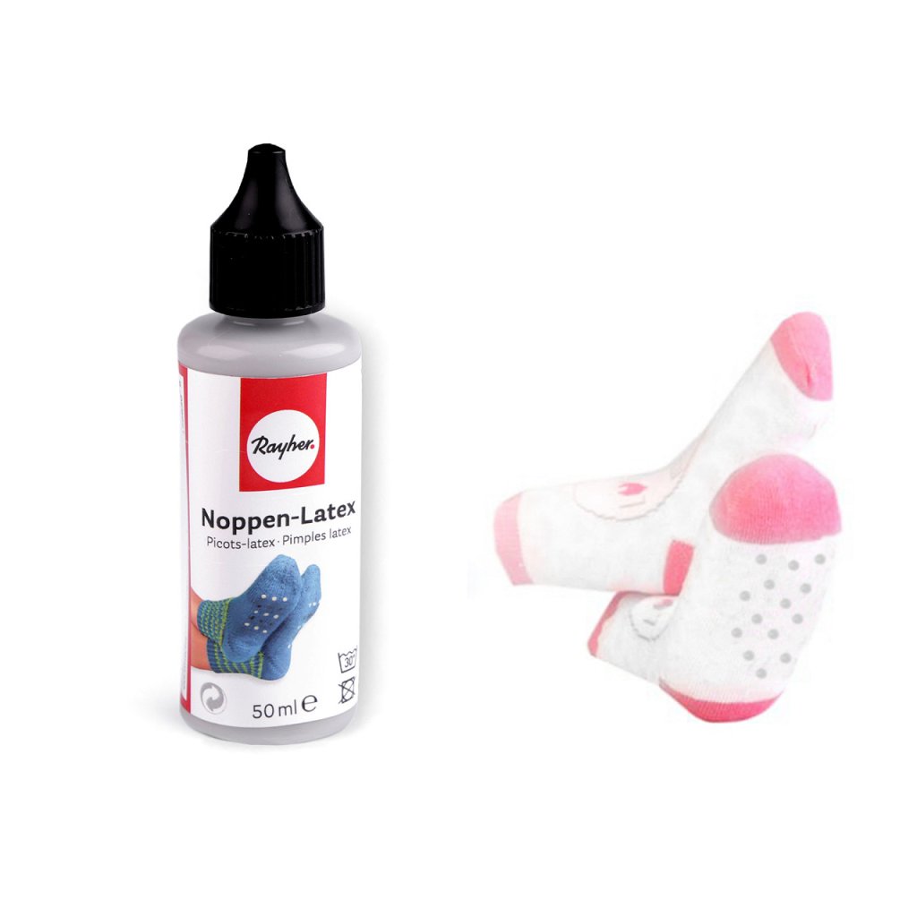 Gumový protiskluz využijete především na ponožky, ale je vhodný i na předložky, koberečky apod. Plastická barva po zaschnutí zajistí protiskluzový efekt, abyste vy nebo vaše dítě neuklouzli. Nanesením malých teček na ponožky, punčochy a papuče z vlny, bavlny, filcu nebo syntetické tkaniny vznikne robustní protiskluzová a otěruvzdorná gumová podrážka. Návod k použití: položte nohu na pevnou lepenku. Obtáhněte kontury chodidla fixem a otisk vystřihněte nůžkami. Vsuňte lepenku do vybrané ponožky nebo punčochy, aby se vytvořila pevná podrážka a mohli jste na ni nanést malé latexové tečky. Latexová hmota se přímo nanáší tenkým otvorem v trysce na lahvičce. Špičku lahvičky je nutné více zastrčit do látky a pak postupně pomalu vytahovat nahoru, aby se latex dostal přímo do struktury a neulpěl jen na povrchu vláken. Vytvářejte malé puntíky v rozmezí 5-6 mm. Doba schnutí je 8-10 hodin. Poté vyjměte lepenku. Ponožky či punčochy jsou pak ihned připraveny k použití. Nástroje očistěte vodou, znečistěné textilie a plochy ihned omyjte vodou. Můžete prát do max. 30°C, nepoužívejte sušičku.