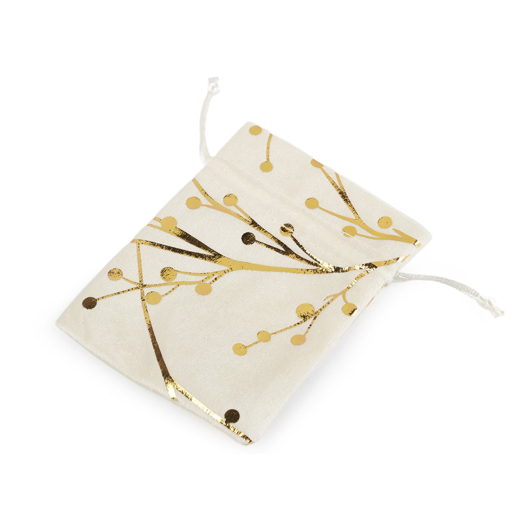 Sametový pytlíček s metalickým potiskem větviček je vhodný na zabalení menších dárků. Jeho luxusní vzhled je dokonalým doplňkem pro jakoukoli příležitost, ať už jde o narozeniny, svatbu nebo jinou slavnostní událost. Dámy mohou nosit sametové pytlíčky v kabelce a schovávat v nich vše, co má být skryto. Pytlík se snadno uzavírá pomocí dvou stahovacích saténových šňůrek.