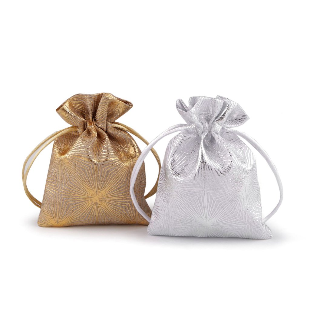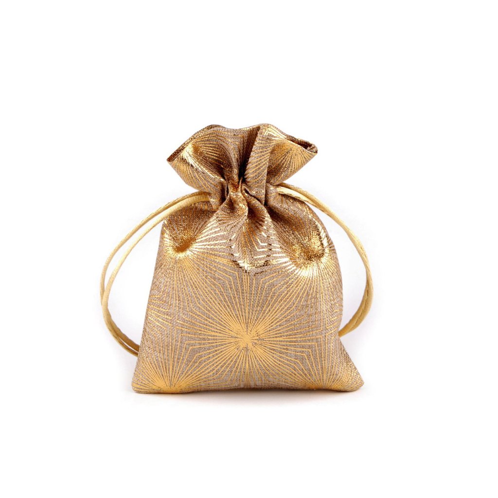 Dárkový pytlík je zajímavý svým luxusním geometrickým vzorem v metalickém provedení. Stahuje se pomocí kulaté saténové šňůrky. Skvěle se hodí na drobné dárky, šperky, kosmetiku nebo jiné malé předměty, které chcete obdarovanému předat s elegancí. Je ideální pro narozeniny, svátky, svatby či jiné významné události, kde vyžadujete atraktivní balení.