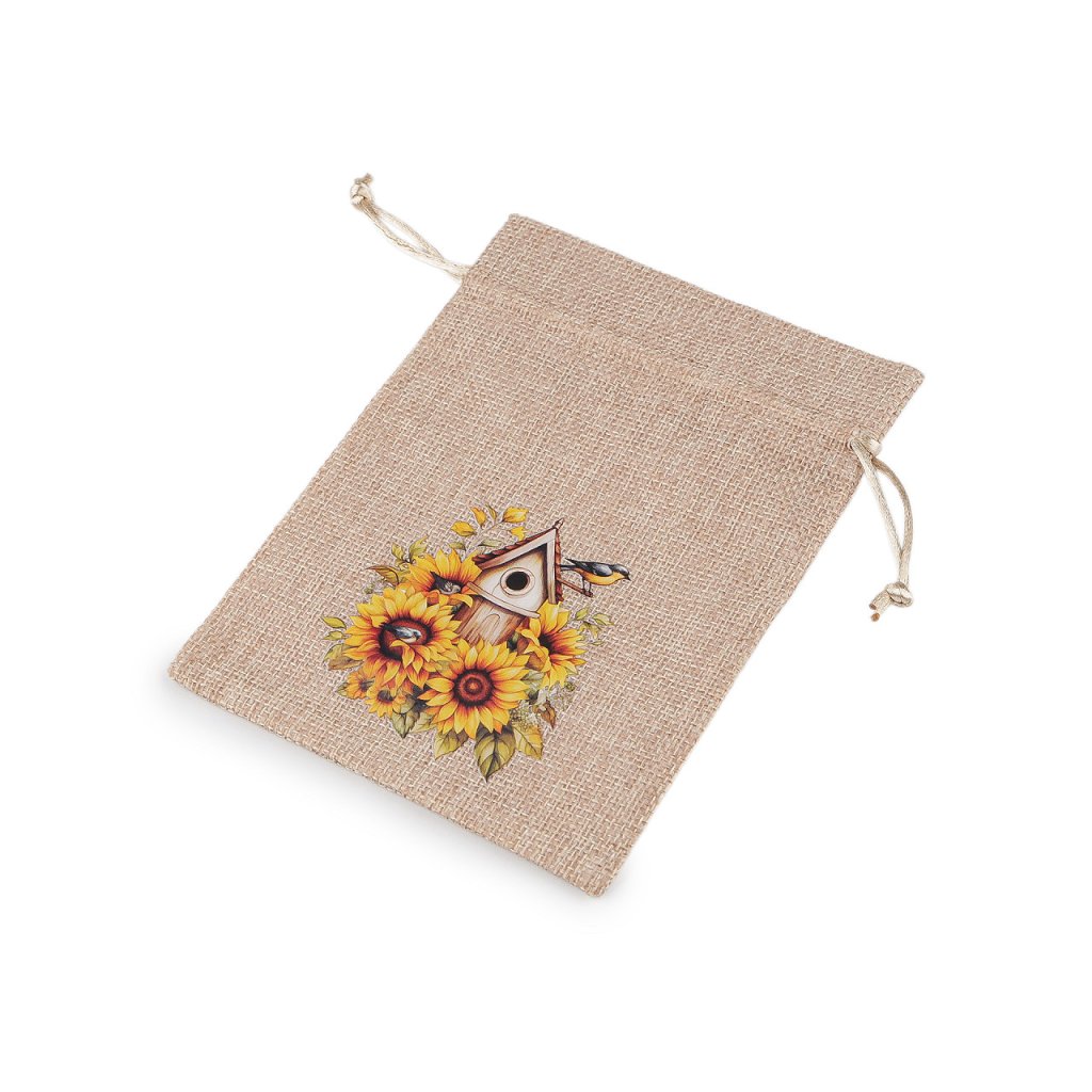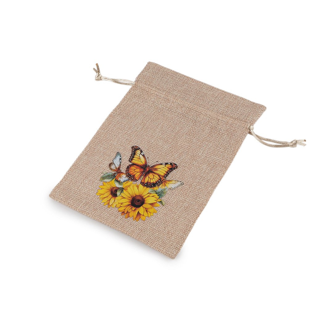 Dárkový pytlík s potiskem slunečnic je skvělý na rychlé zabalení malých dárků. Materiál pytlíku svým zpracováním připomíná jutu. Uzavírá se pomocí stahovacích saténových šňůrek. Potisk je na přední straně pytlíku, je pogumovaný.