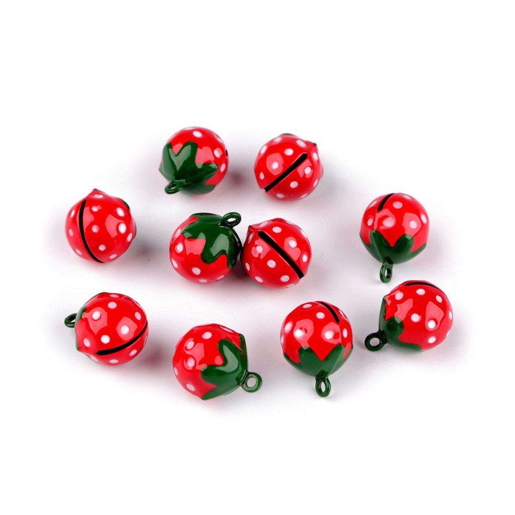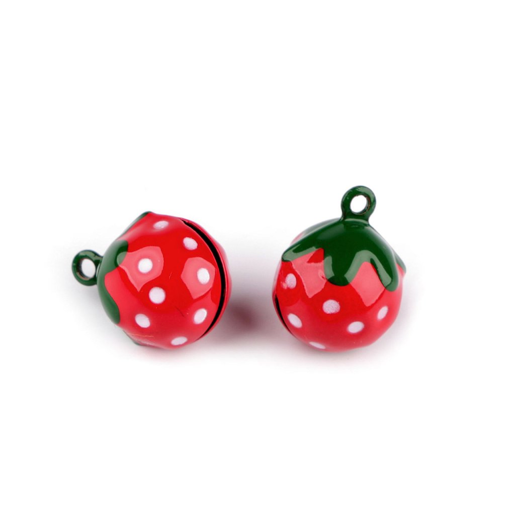 Kovové rolničky mají design jahody. Můžete s nimi ozdobit tematické dárky, věnce, svícny apod. Nahoře mají otvor na provlečení šňůrky nebo háčku.