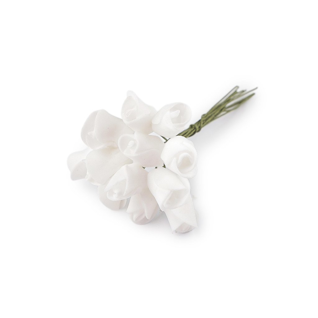 Mini růže jsou vyrobené z pěnové gumy. Drátek, který je jejich součástí, usnadňuje připevnění a manipulaci. Růžičky využijete do svatebních voniček, na věnce i k výrobě různých dekorací a květinových aranžmá.