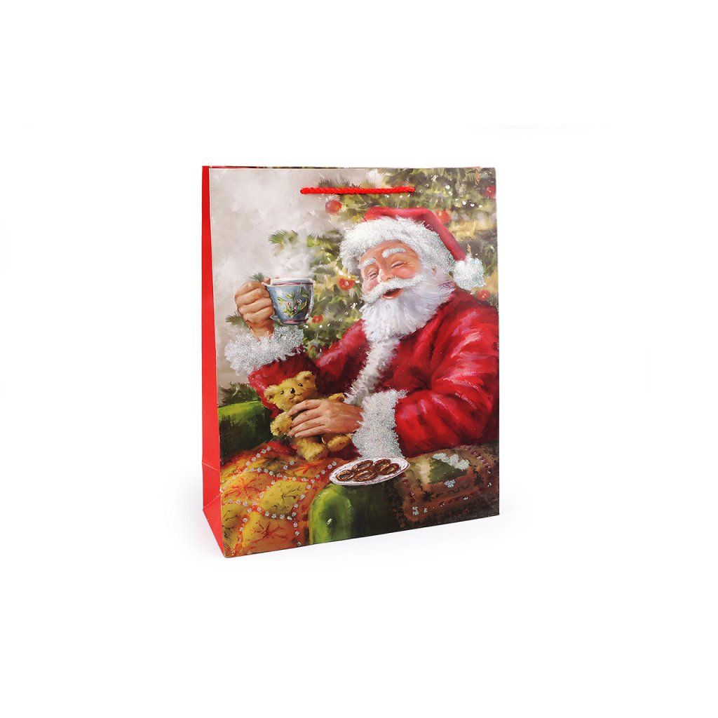 Vánoční dárková taška s motivem Santa Clause s glitry je vyrobená z kvalitního pevného křídového papíru. Přední strana tašky je zdobená motivem s glitry, zadní strana je hladká. Ucha tašky jsou ze spletené šňůry. Taška vám ušetří čas při balení dárků.