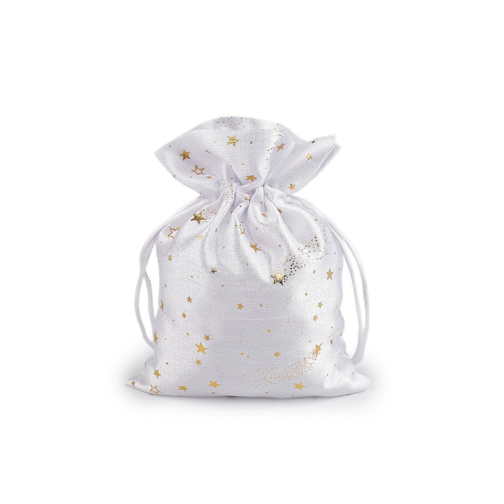 Vánoční dárkový pytlík je z obou stran ozdobený potiskem zlatých metalických hvězdiček. Působí elegantně a luxusně, můžete ho použít na dárky nebo ho naplnit mikulášskou nadílkou, ušetří vám čas při balení. Dá se naaranžovat i jako vánoční dekorace. Stahuje se pomocí kulatých saténových šňůrek, dárku dodá osobní kouzlo a půvab.