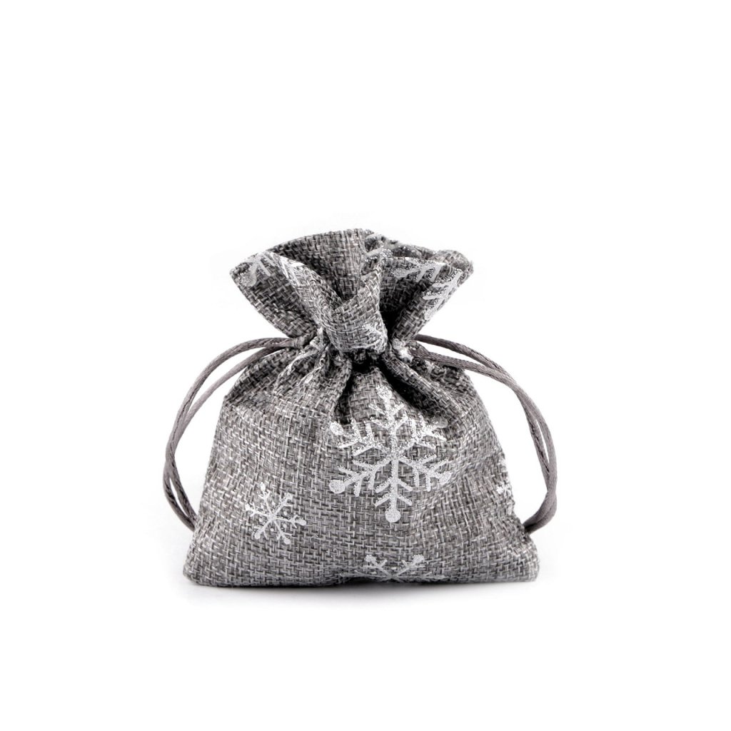 Malý dárkový pytlík s potiskem vloček je zajímavý materiálem, který imituje jutu. Potisk je jemně ozdobený třpytivými glitry. Pytlík se stahuje pomocí saténových šňůrek. Do pytlíku můžete schovat drobné dárky nebo jej použít jako vánoční dekoraci. Můžete jej použít jako stylovou alternativu k tradičnímu balicímu papíru, která zaručeně potěší jak obdarovaného, tak i vás. Je také skvělý pro uskladnění drobných předmětů po celý rok.