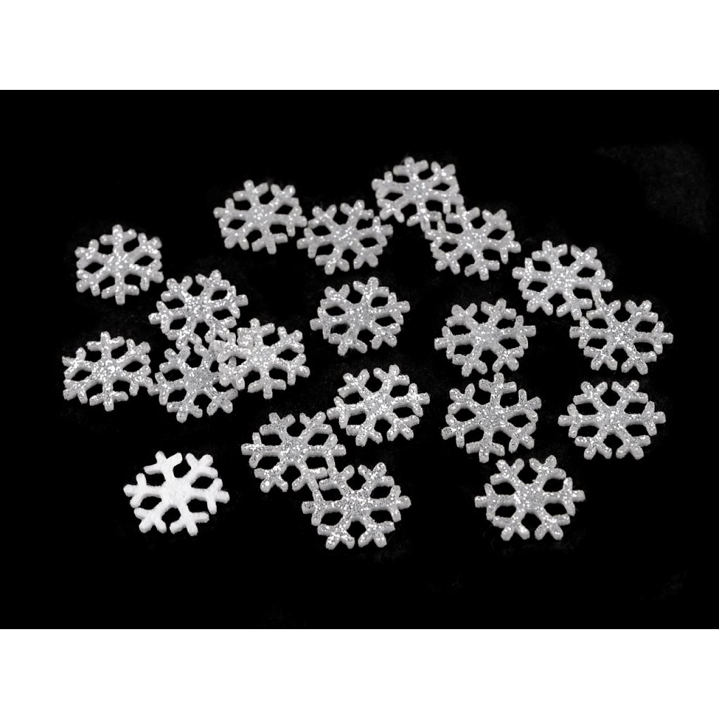 Malé filcové vločky zdobí z jedné strany třpytivé glitry. Můžete je nalepit na adventní věnce, jmenovky na slavnostní tabuli, přáníčka a různé vánoční dekorace.