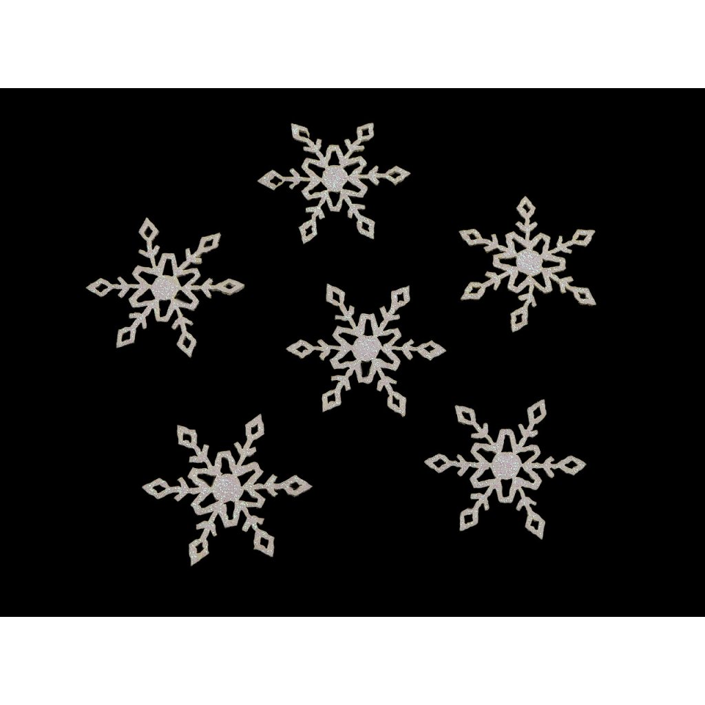 Filcové vločky zdobí z jedné strany třpytivé glitry. Můžete s nimi ozdobit adventní věnce, jmenovky na slavnostní tabuli, přáníčka a různé vánoční dekorace.