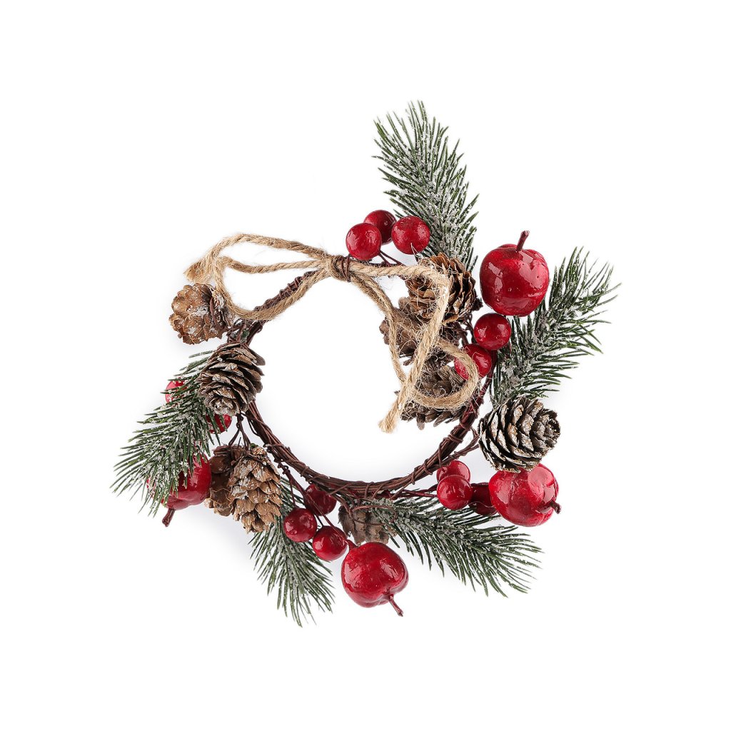Malý dekorační věneček vám bude dělat společníka po celé zimní období. Zdobí ho umělé lehce zasněžené větvičky, bobule, jablíčka a přírodní šišky. Můžete ho pověsit na dveře, do okna, na krbovou římsu nebo na úchytky skříněk. Lze ho ale také naaranžovat na svíčku s průměrem maximálně cca 7 cm.