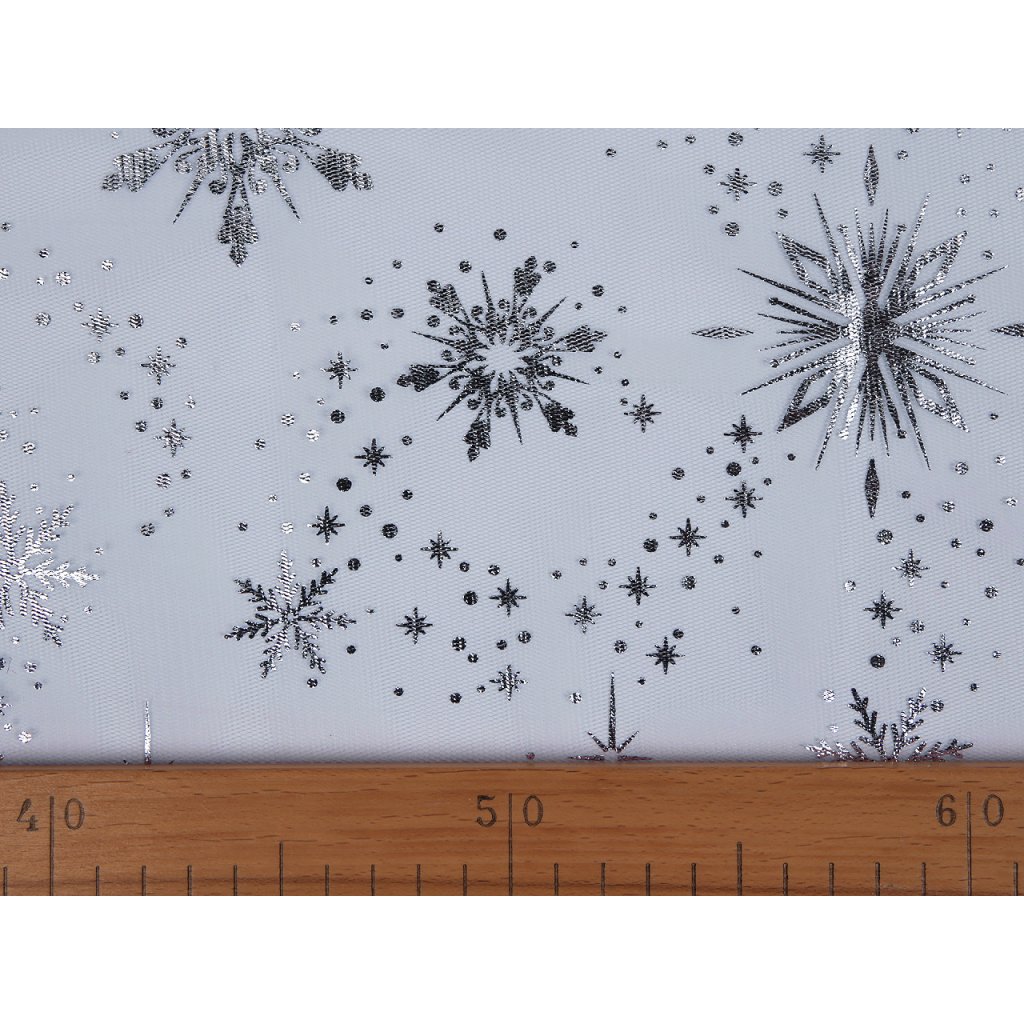 Tyl s potiskem vloček je jemný, měkký a pružný po šíři. Využijete ho na šití sukýnek, karnevalových kostýmů i různých dekorací a zimních aranžmá. Potisk vloček je lesklý a najdete ho po celé šíři na obou stranách.
