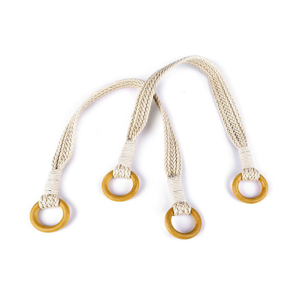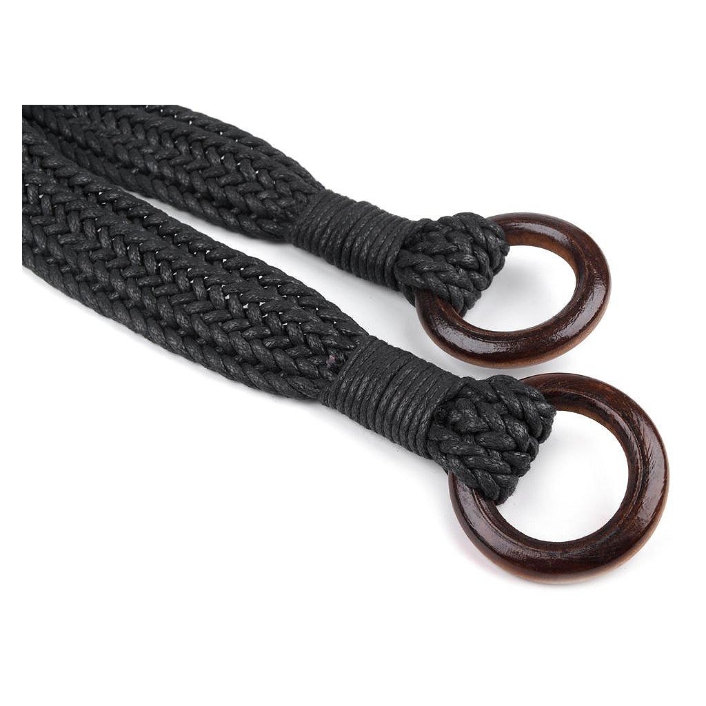 Proplétaná ucha na tašky jsou vyrobena z textilní voskované šňůry, která je na obou stranách zakončena dřevěnými kroužky. Ucha využijete při výrobě tašek nebo kabelek.Celková délka uch může pohybovat v rozmezí 50 - 54 cm.