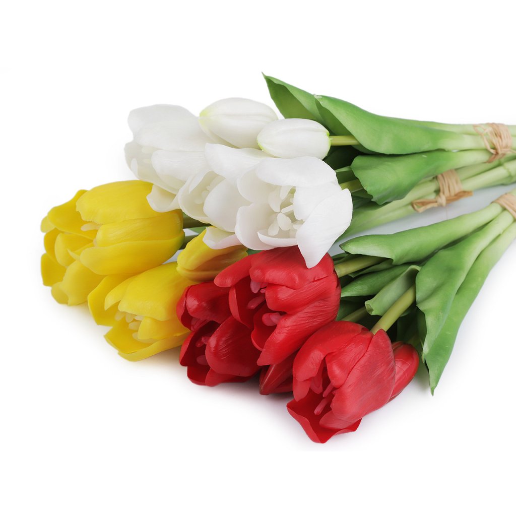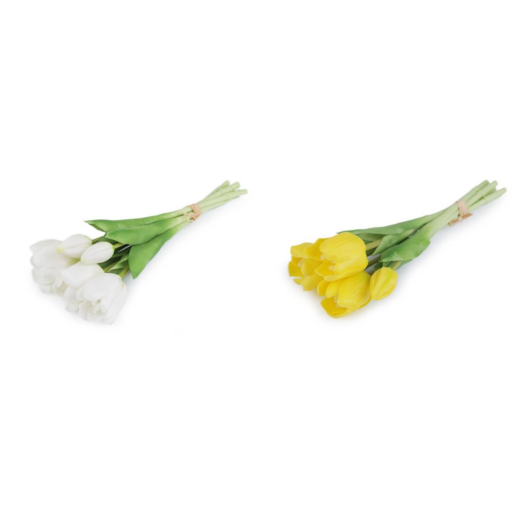 Kytice tulipánů vypadá luxusně a velice realisticky. Měkký plast, ze kterého jsou vyrobené, má efektní probarvení. Uvnitř každého stonku je drát. Tulipány vyniknou v jednoduché váze. Využijete je ale také na dekorační vazby, ikebany nebo věnce.