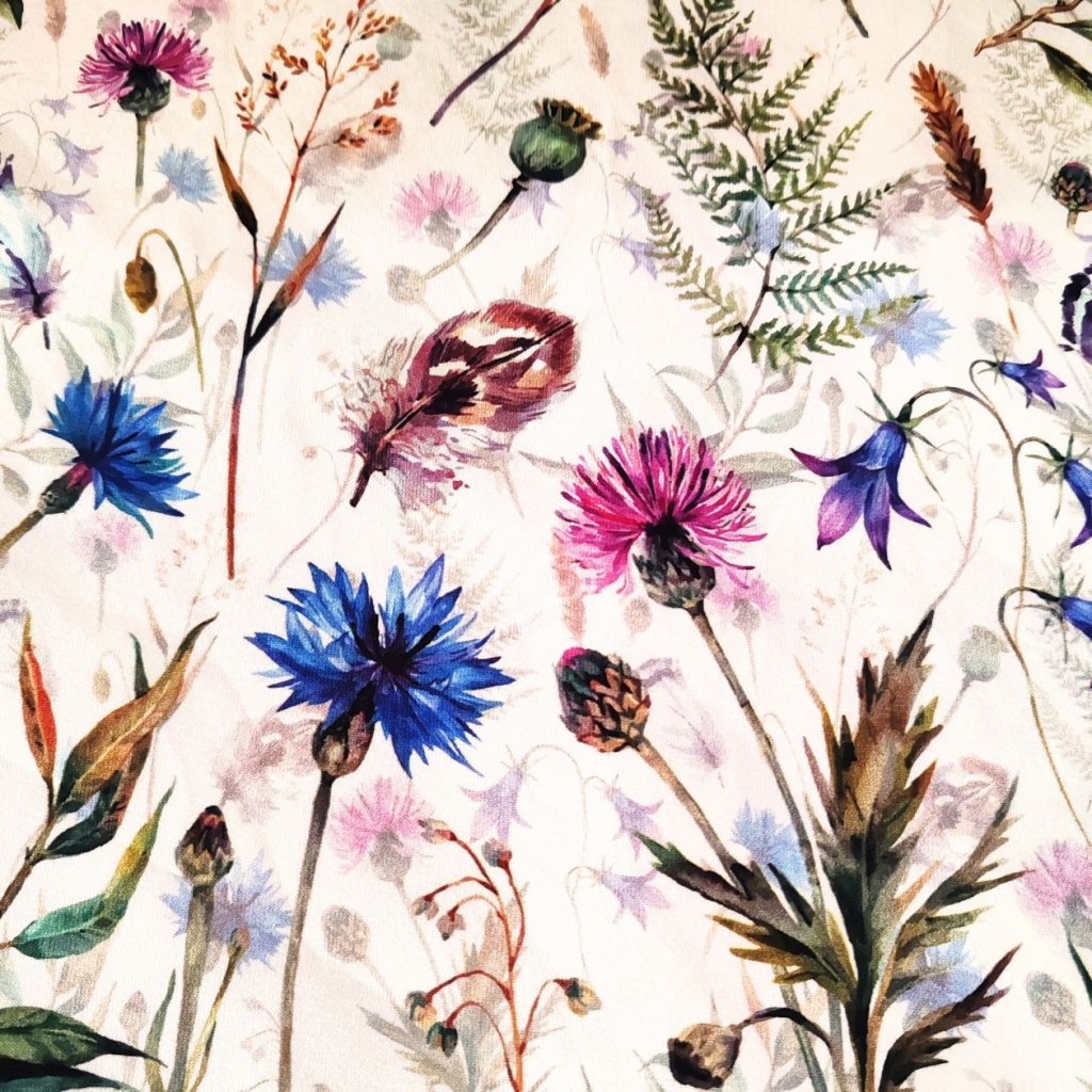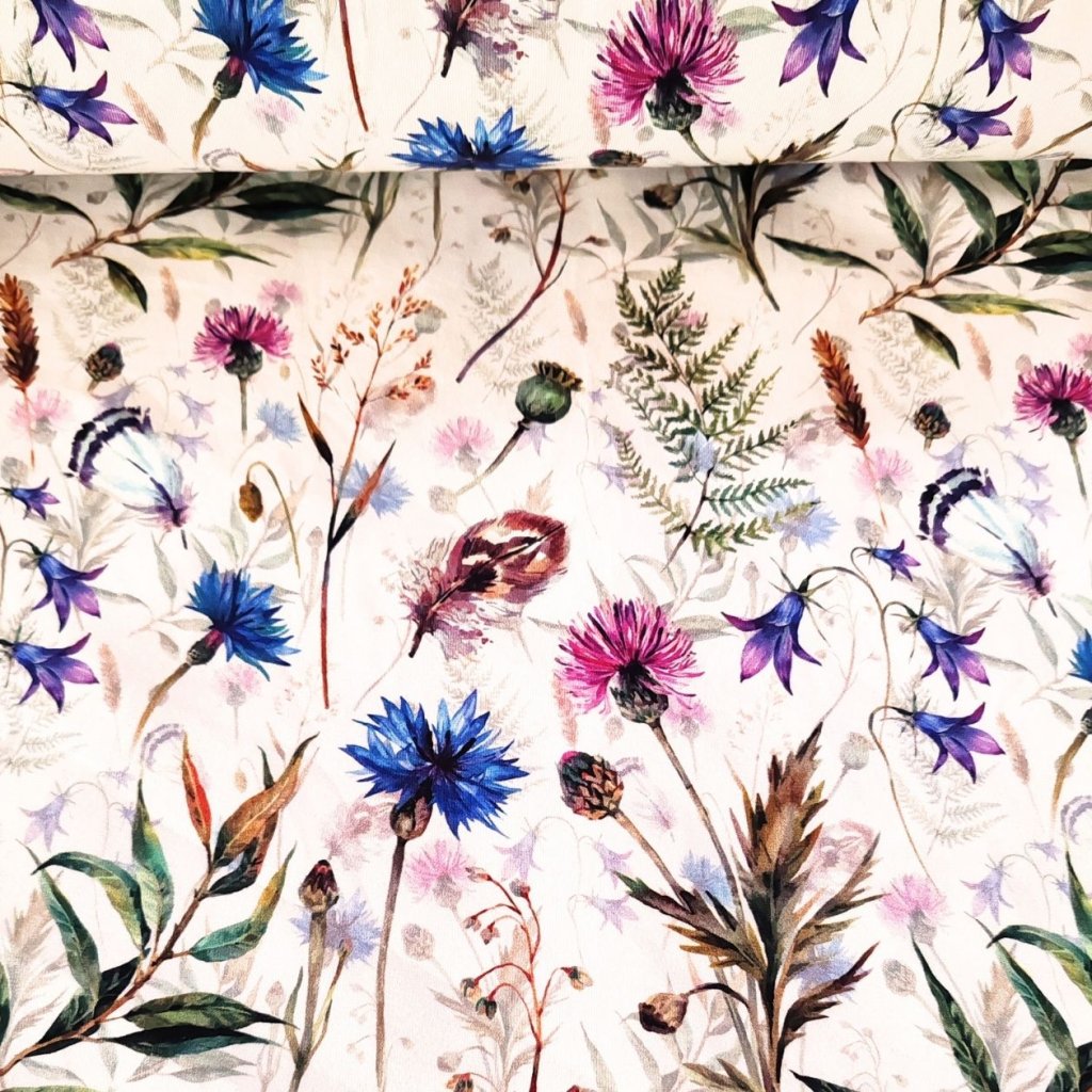 Bavlněný úplet v prémiové kvalitě s motivem nádherných modrých a fialových chrpových květů. Kvalitní tisk a materiál od prověřeného dodavatele. Kdo u nás již bral, tak ví :-) Potisk i materiál vydrží opakované praní, barvy jsou stále zářivé a nežmolkovatí.