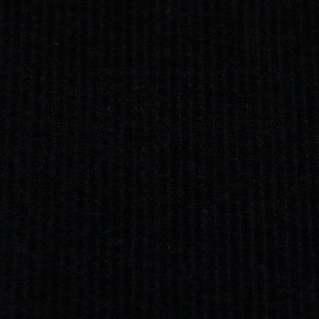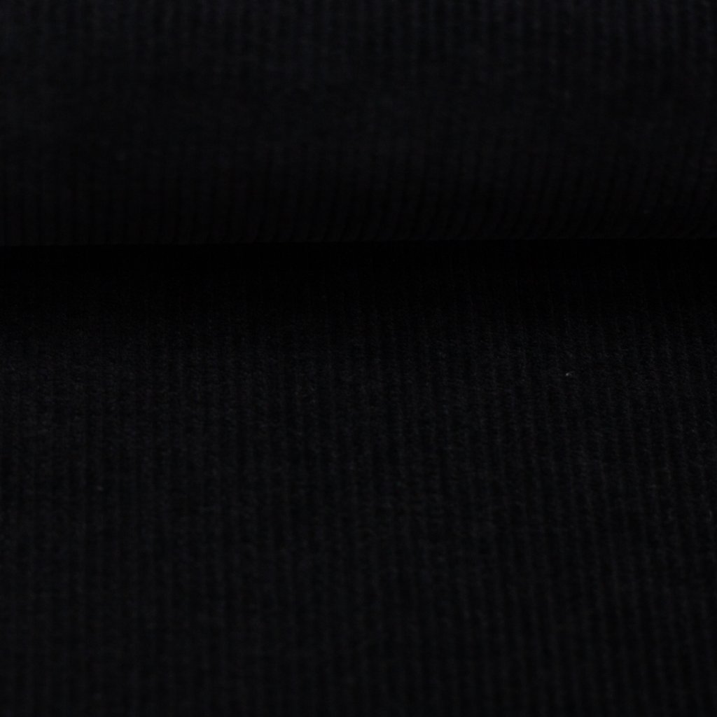 Tento černý úpletový velur je symbolem nadčasové elegance a pohodlí v jednom. Látka kombinuje vzhled klasického manšestru s měkkostí a pružností úpletu, což z ní dělá výjimečně univerzální materiál pro šití. Povrch má jemné žebrování a sametový lesk, který dodává černé barvě hloubku a elegantní charakter.