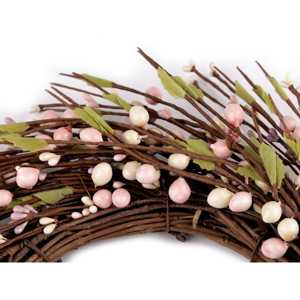 Věnec bohatě zdobený malými barevnými bobulemi vám zútulní interiér během jara a podzimu. Střídají se na něm umělé větvičky s přírodními.