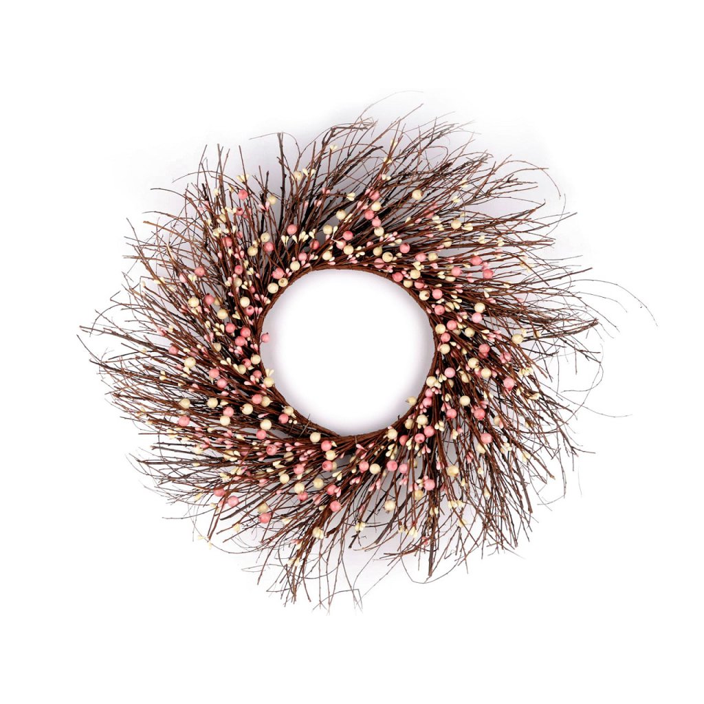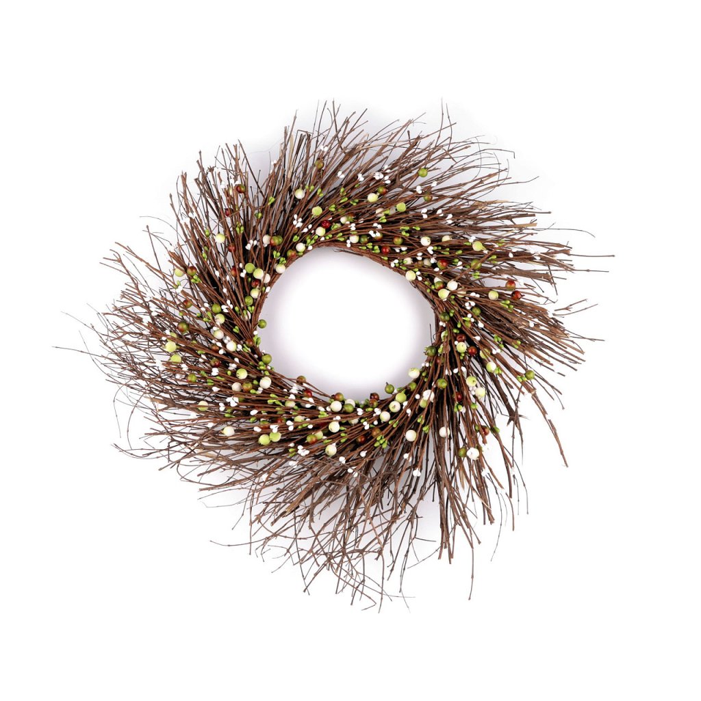Věnec bohatě zdobený barevnými bobulemi vám zútulní interiér během jara a podzimu. Střídají se na něm umělé větvičky s přírodními.