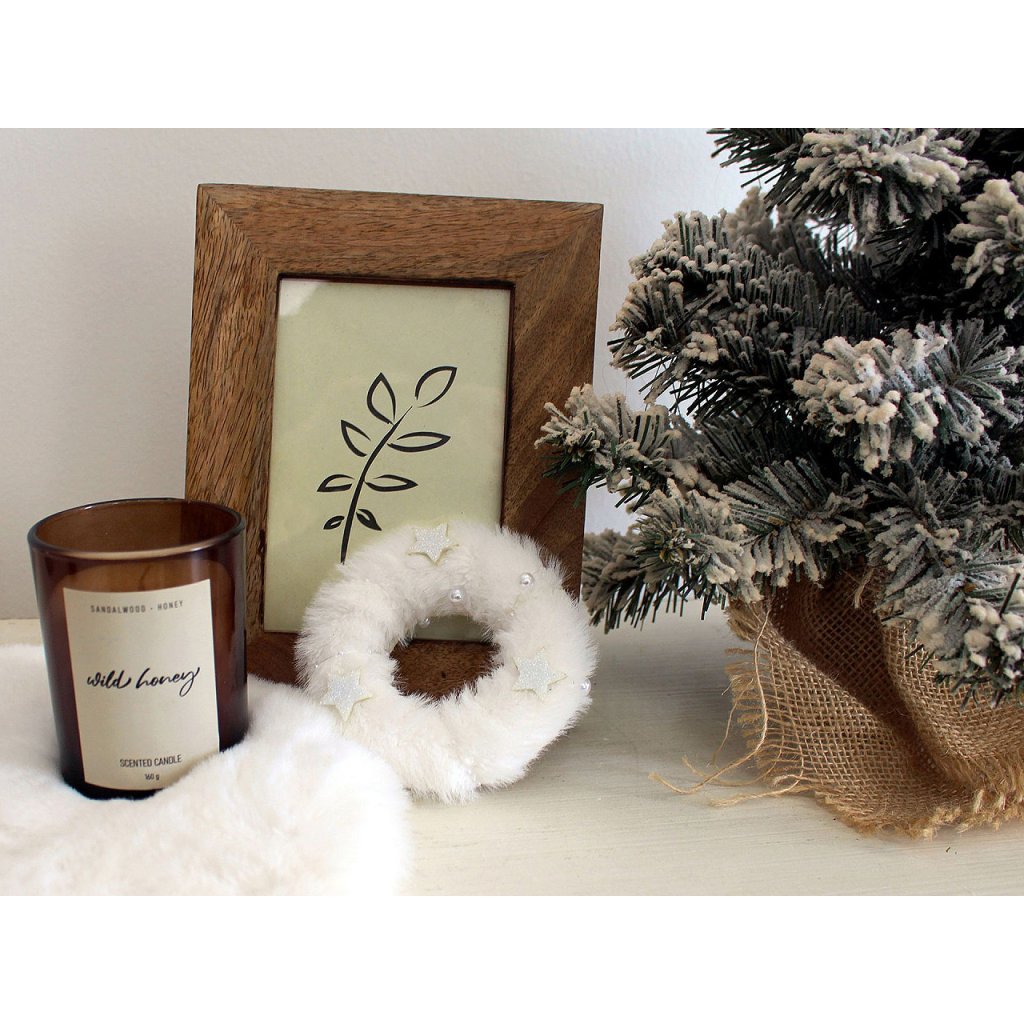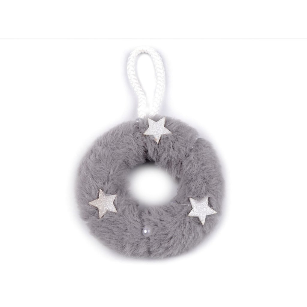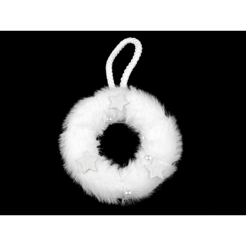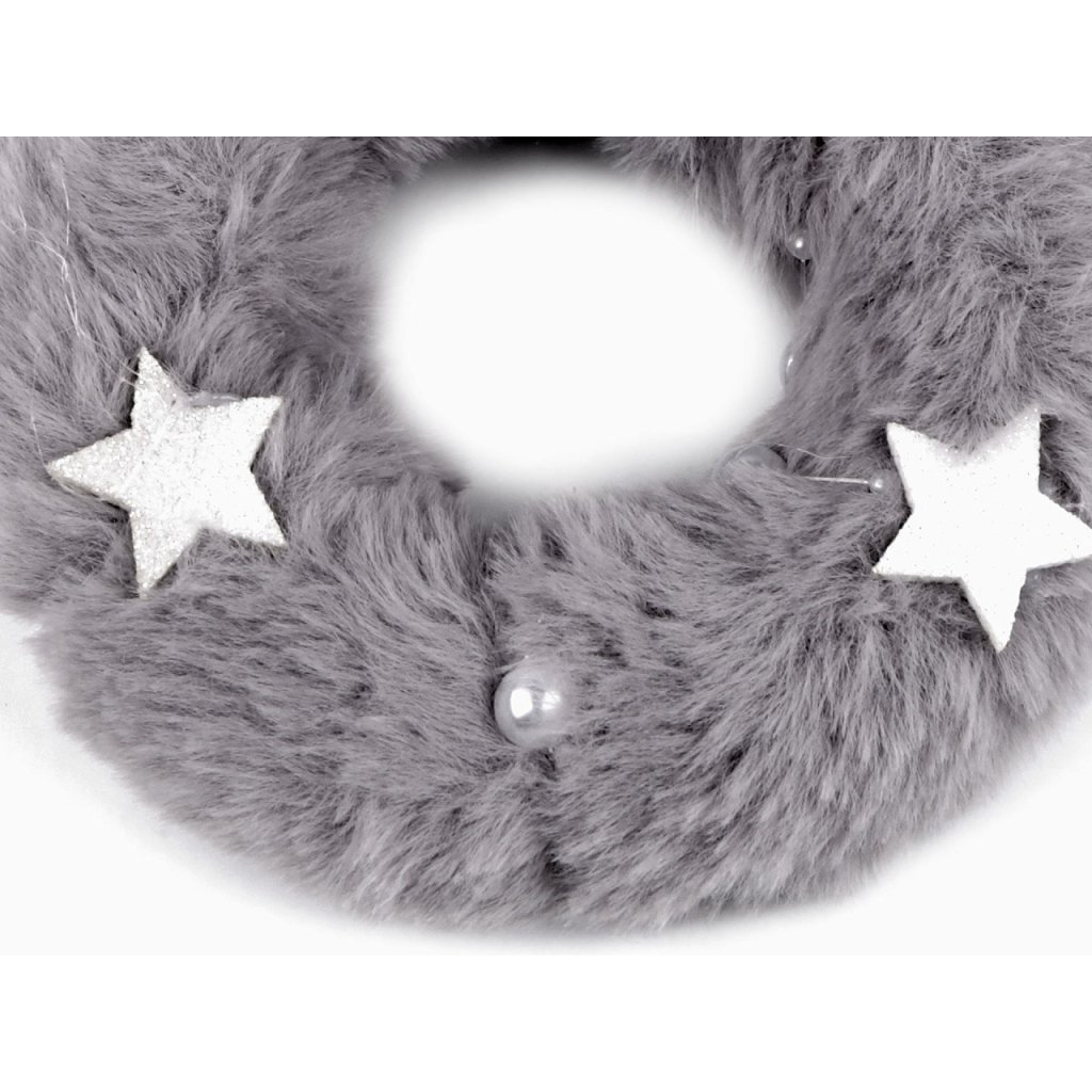 Malý věneček s umělou kožešinou vám bude dělat společníka nejen během Adventu a Vánoc, ale i po celé zimní období. Základ věnce je z polystyrenu, díky tomu je lehký. Zdobí ho detaily v podobě třpytivých hvězd a perlových korálků. V horní části je provázek na zavěšení.