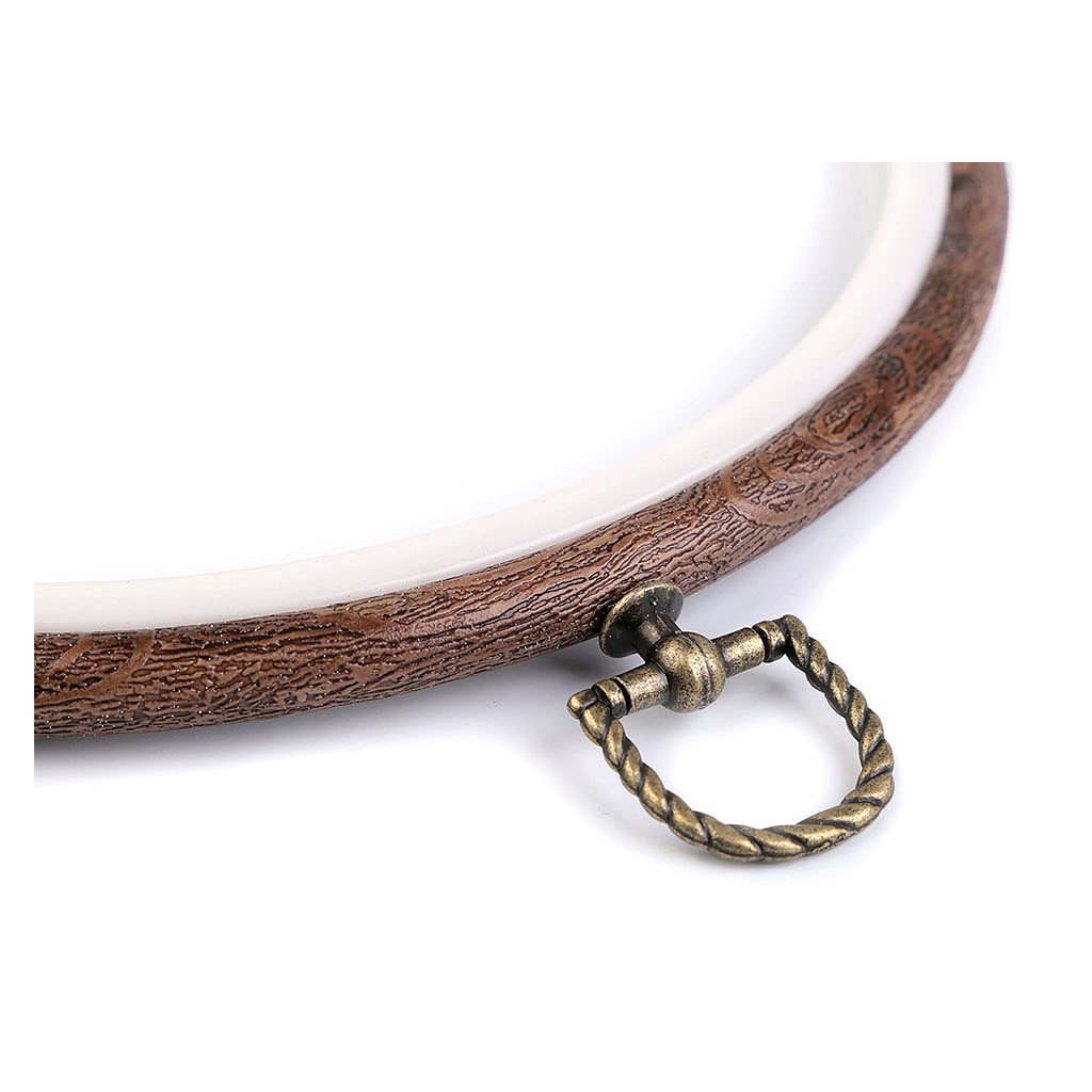 Vyšívací kruh je vyrobený z pryže, která imituje dřevo, a plastu. Je opatřen kovovým šroubkem, pomocí něhož můžete kruh pověsit na stěnu.