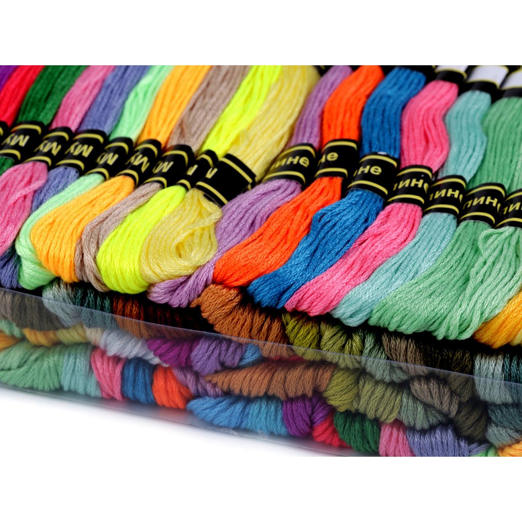 Vyšívací příze typu mouline se skládají ze 6 dělitelných vláken. V balení dostanete 100 ks přízí z náhodných barev různých odstínů, kde se barvy mohou opakovat. Jednotlivá balení se však mohou složením barev lišit.