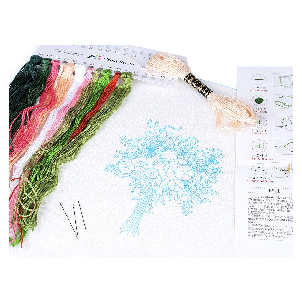 V sadě najdete tkaninu s předlohou, sadu barevných přízí, obrázkový návod a vyšívací jehly. Kruh není součástí sady.