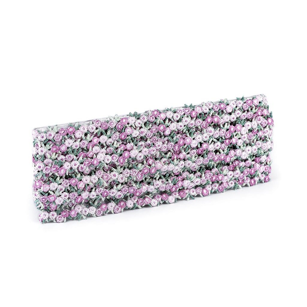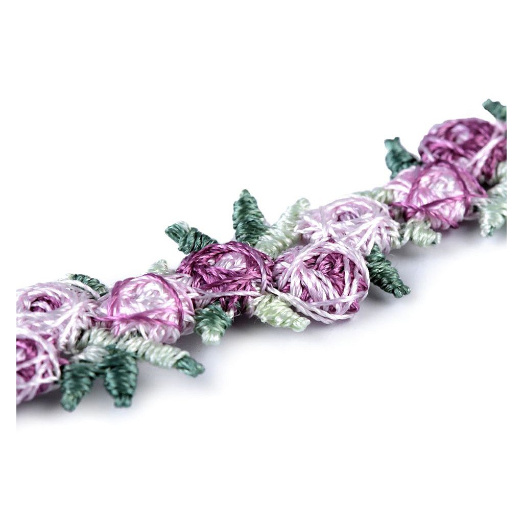 Vyšívaný prýmek s drobnými kvítky nevšedně ozdobí nejen vaše halenky, košile, šaty a sukně, ale také doplňky jako tašky, klobouky, čelenky apod. Využijete jej také k dekorování ubrusů, prostírání, polštářů a jiného bytového textilu.