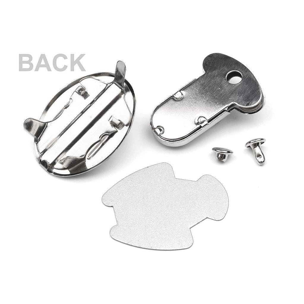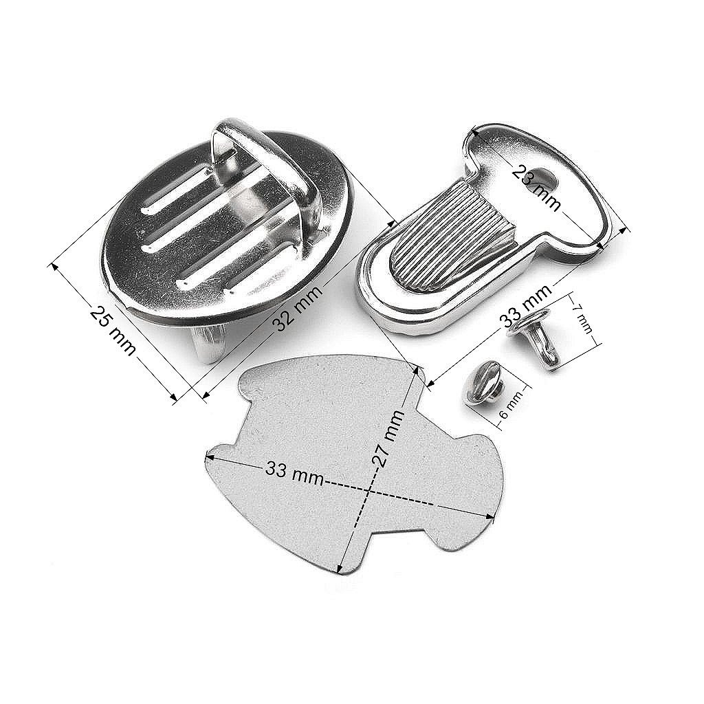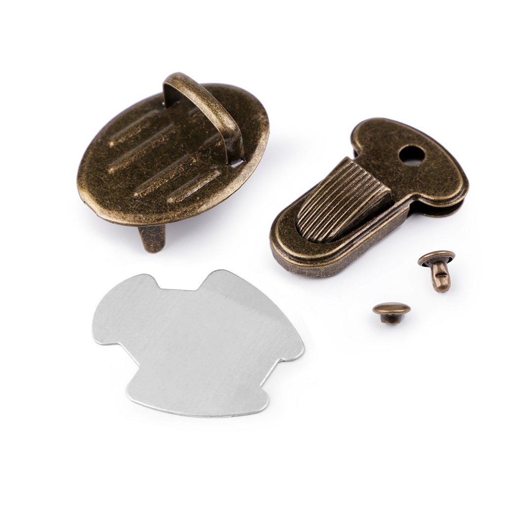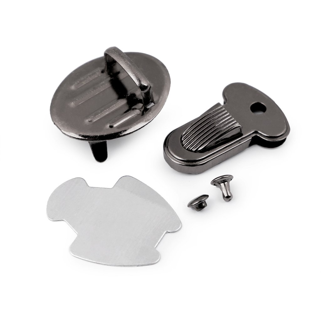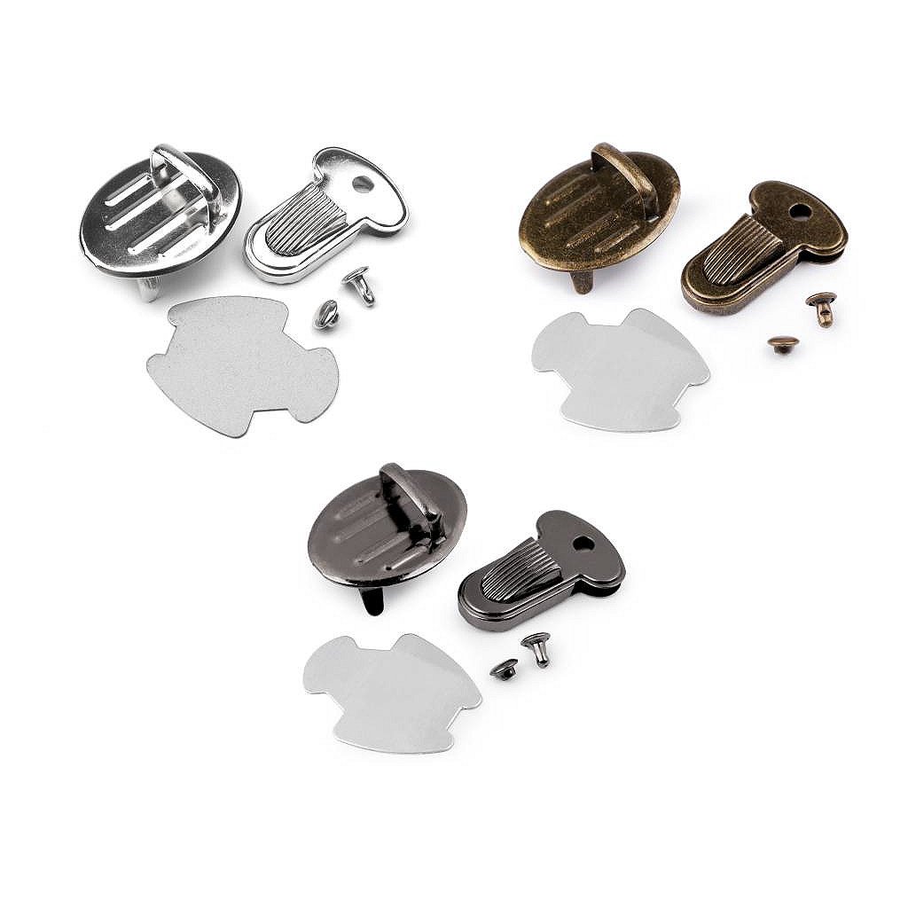 Zapínání na kabelku či tašku se skládá ze dvou dílů a plíšku. Jeden díl se připevní na na vnější část kabelky, z druhé strany se zajistí plíškem, a další díl na chlopeň kabelky. Pak už jen stačí zasunout do sebe tak, až uslyšíte cvaknutí. Potom je teprve kabelka bezpečně uzavřena.Součástí sady jsou nýtky, které patří k dílu na chlopeň.