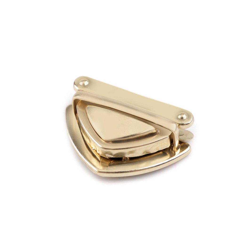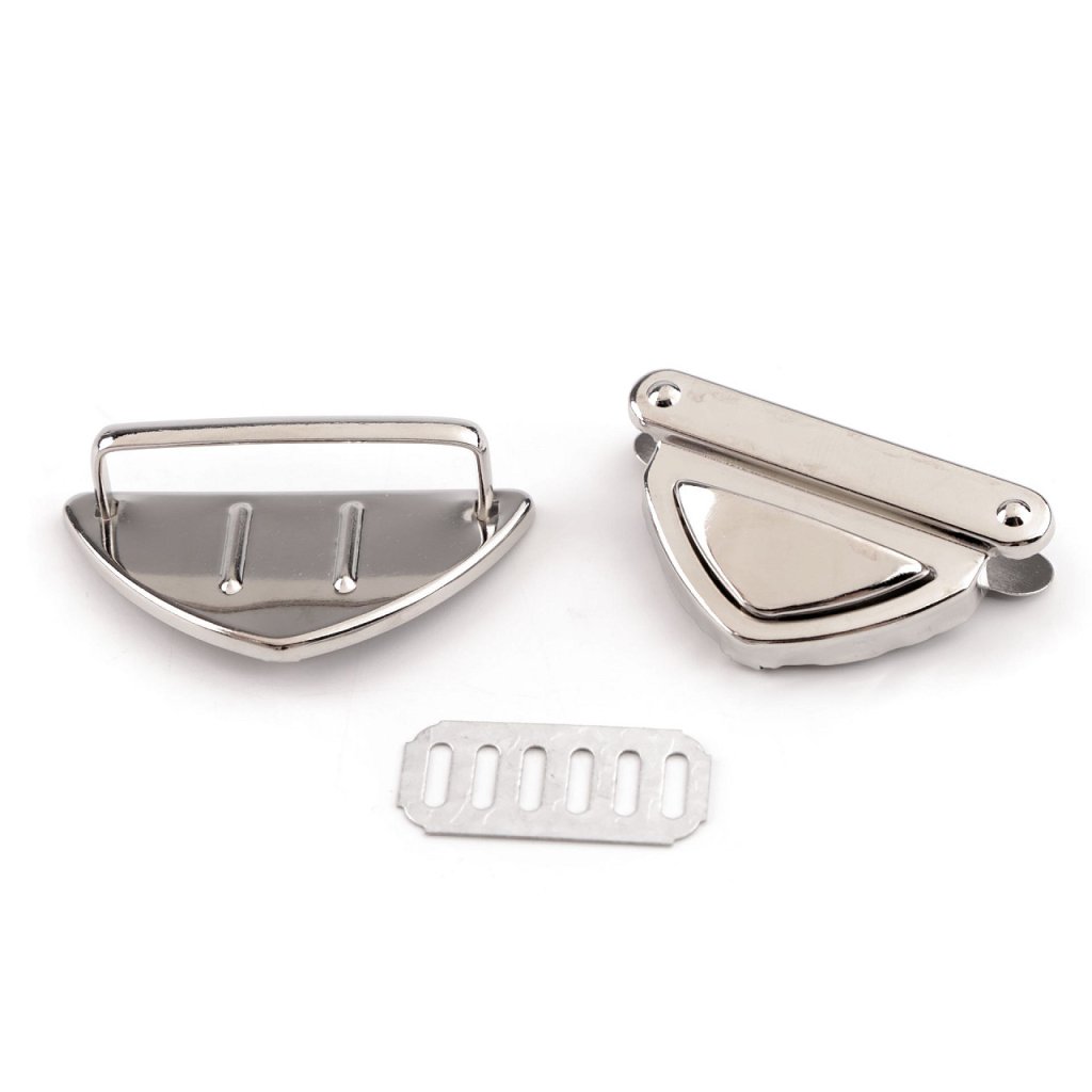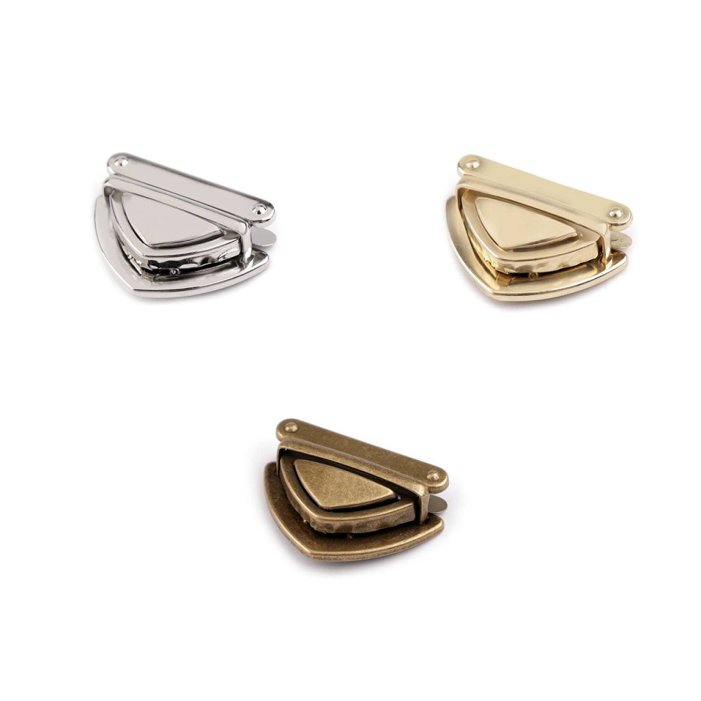 Kovové zapínání s klasickým designem využijete na tašku či kabelku. Skládá se ze tří dílů. Plíšek se připevní na vnitřní část tašky, díl s nožkami na vnější část (nožky se zaháknou do plíšku a roztáhnou) a třetí díl se zoubky na její chlopeň. Díl na chlopeň se upevní tak, že rozevřete čelisti, na kterých jsou zoubky a mezi ně vložíte materiál, na který chcete zapínání upevnit. Následně čelisti sevřete, zoubky tak zamezí pohybu látky.