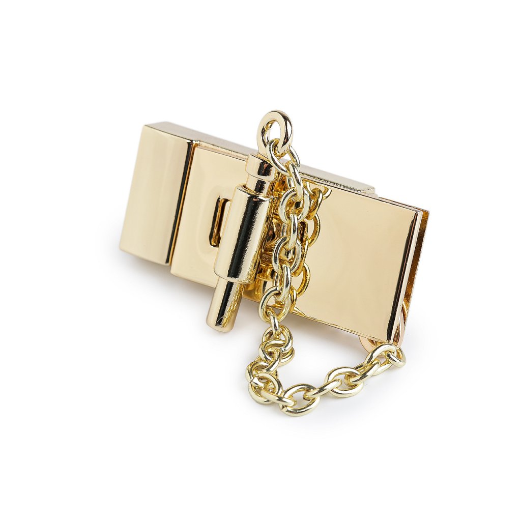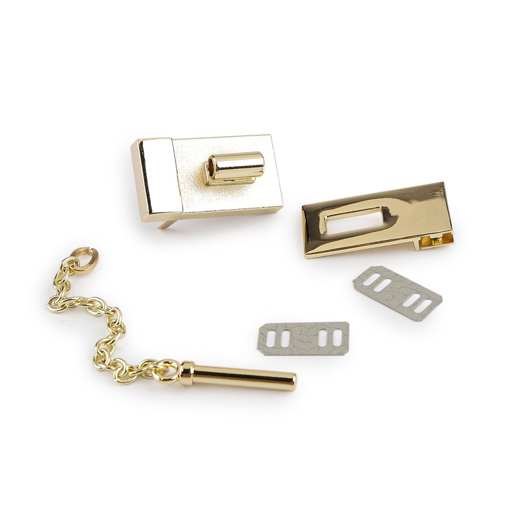 Designové kovové zapínání elegantně vynikne na taškách, kabelkách a městských batozích s klopou. Jeden díl se připevňuje pomocí přiložených šroubků a druhý díl se upevňuje nožičkami, které se z rubové strany zajistí plíšky. Zapínání se zajistí tyčinkou na řetízku, která se připevňuje v místě, kde jsou šroubky.