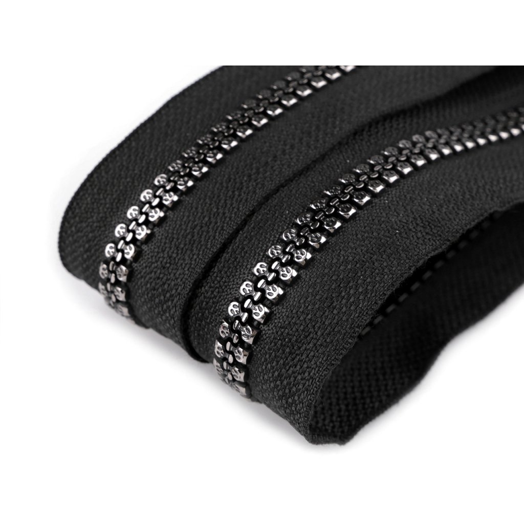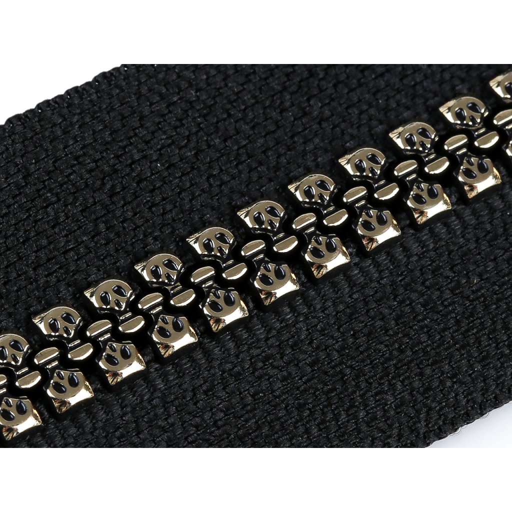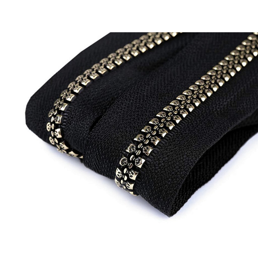 Kostěný zip v metráži má efektní zoubky s designem drobných lebek. Využijete ho na oděvy (mikiny, bundy, kabátky), kabelky, pouzdra nebo na výrobu zipových tašek.