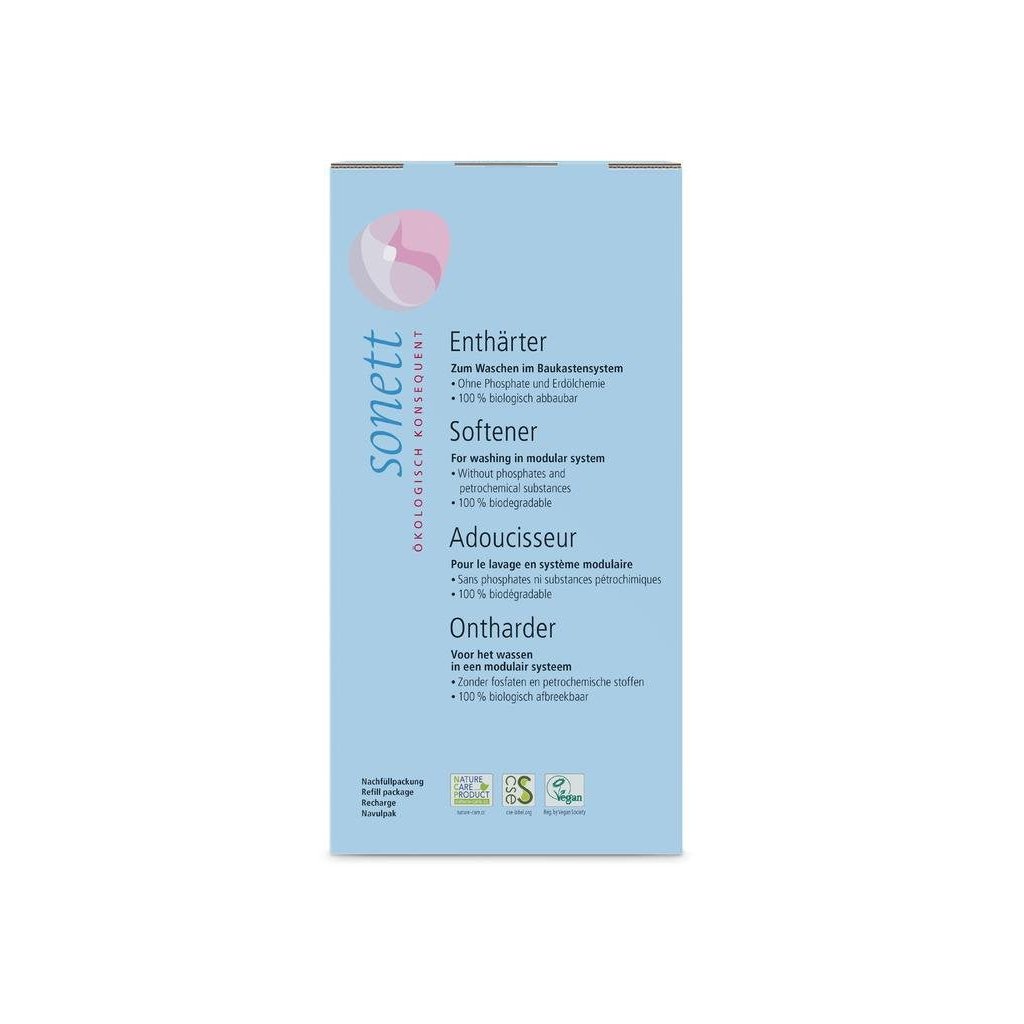 Máte-li příliš tvrdou vodu, je vhodné do praní přidat zvlášť změkčovač vody pro zvýšení účinku mýdla jako hlavní aktivní složky pracích prostředků Sonett. Zaručí se tak maximálně ekologické i ekonomické použití.