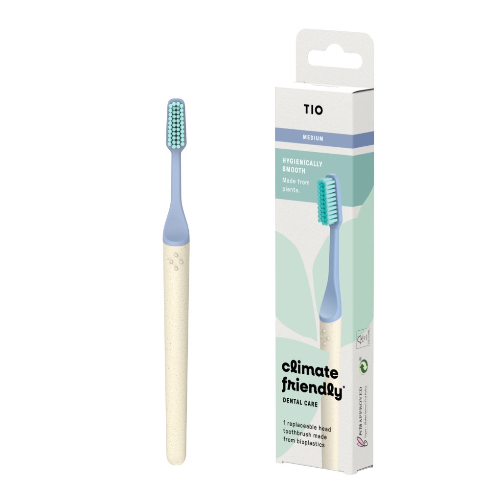 TIO přichází s inovovaným zubním kartáčkem TIOBRUSH, který je vyroben téměř výhradně z obnovitelných zdrojů. . Bez ropných složek - kartáčky jsou vyrobeny téměř kompletně z rostlinných polymerů - štětinky z ricinového oleje, hlavice z celulózových vláken s certifikací FSC a rukojeť z cukrové třtiny. . Štětinky laskavé k dásním - profil zaoblených štětinek TIO je založen na nejnovějších výzkumech a klinických studiích, aby se kartáček o vaše zuby postaral optimálně a nedráždil dásně. K dispozici je varianta SOFT s měkčími štětinkami a MEDIUM s tvrdšími. . Udržitelný design - kartáčky vás okouzlí nejen atraktivním zevnějškem, obalové materiály lze recyklovat a rukojeť zachovat a vyměňovat pouze náhradní hlavice. Tímto způsobem ušetříte cca 70 % odpadu ve srovnání s kompletní výměnou celého kartáčku. . Hygiena - vyměnitelná hlavice přesně přilne k rukojeti, díky tomu nedochází k množení bakterií.. Ergonomický tvar rukojeti - díky perfektnímu tvaru se kartáček skvěle drží v ruce. . Férová produkce - na rozdíl od bambusových kartáčků výroba TIOBRUSH probíhá v Německu - zaručuje férové ohodnocení a pracovní podmínky.